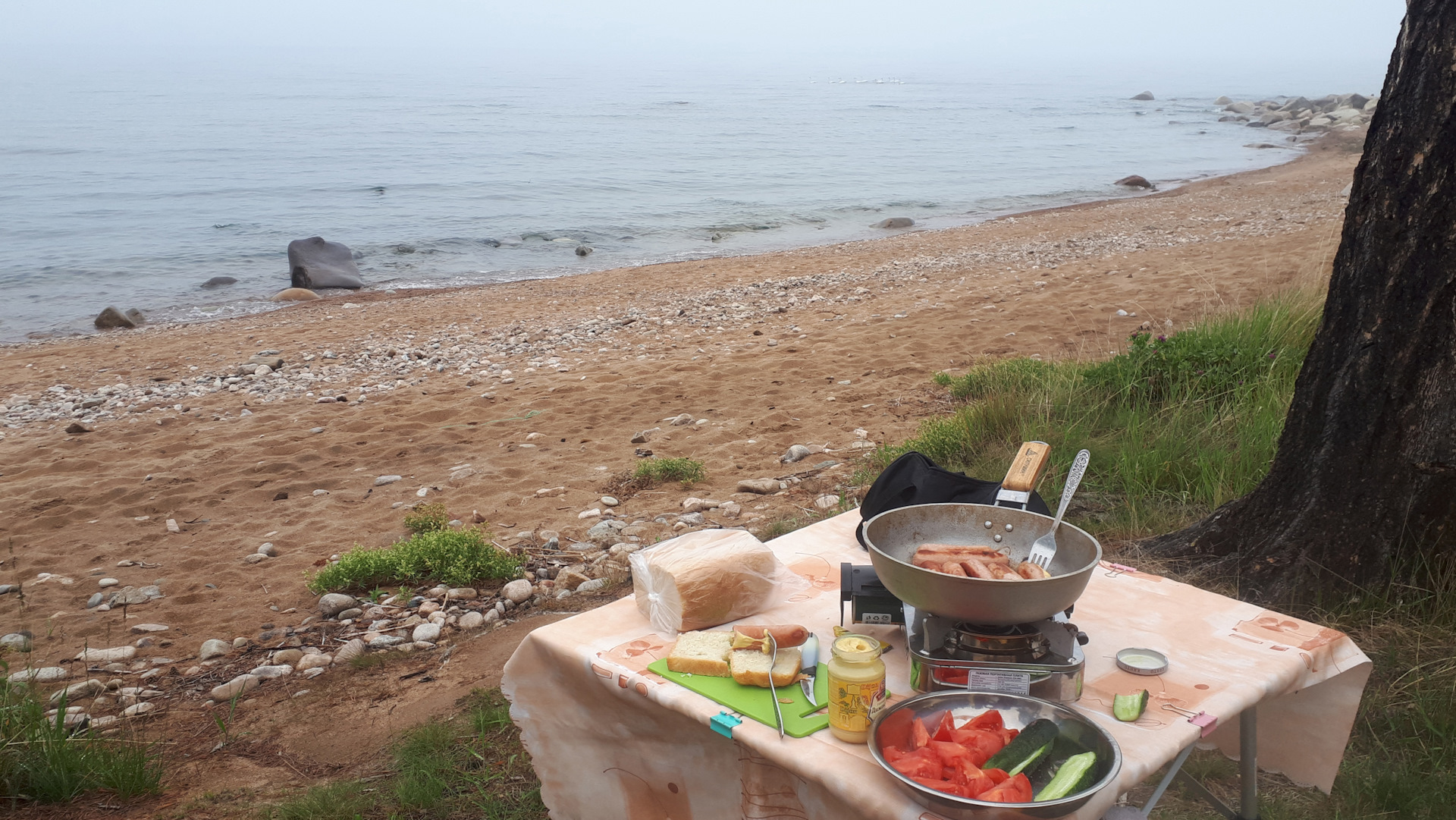 С отличный настроением мы трапезничали на берегу Великого Байкала.
