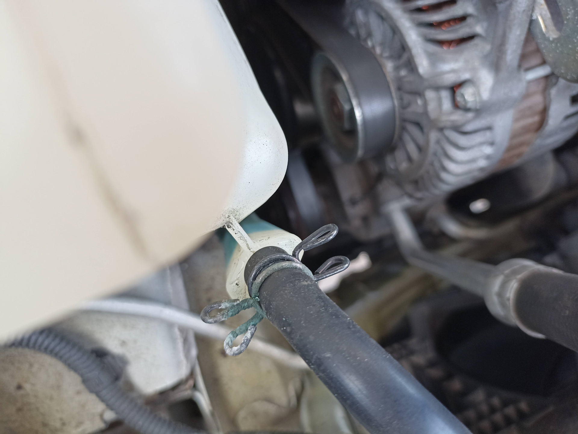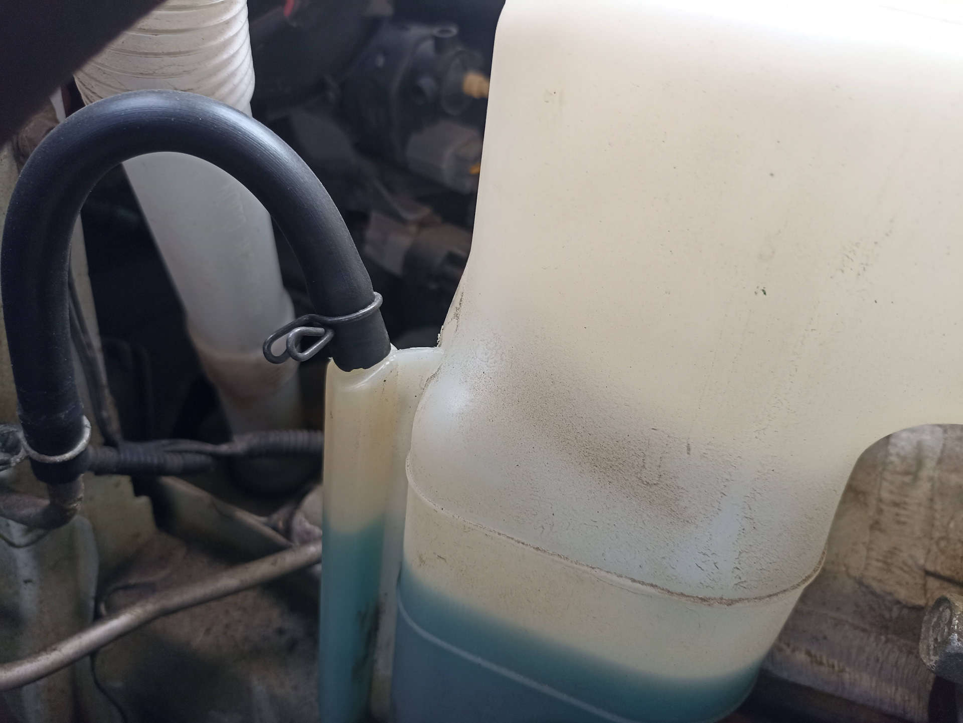 Пробег 160 тыс. стал замечать, что бачок снизу мокреет и под ним капли антифриза, также крышка вся грязная и мокрая. При этом уровень как был на FULL, так и остался. Никогда не доливал антифриз. На черном патрубке видны пятна цвета антифриза. Сначала думал, что бачок лопнул по шву — поэтому подтекает. На всякий случай поставил простой винтовой хомут на патрубок — на конец у расширительного бачка. Будем посмотреть…