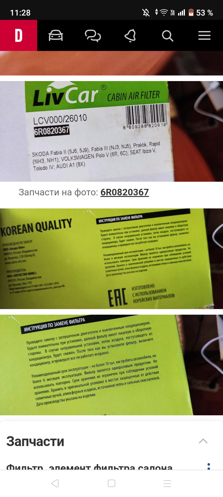 Брал салонный фильтр угольный и антибактериальный ливкар.