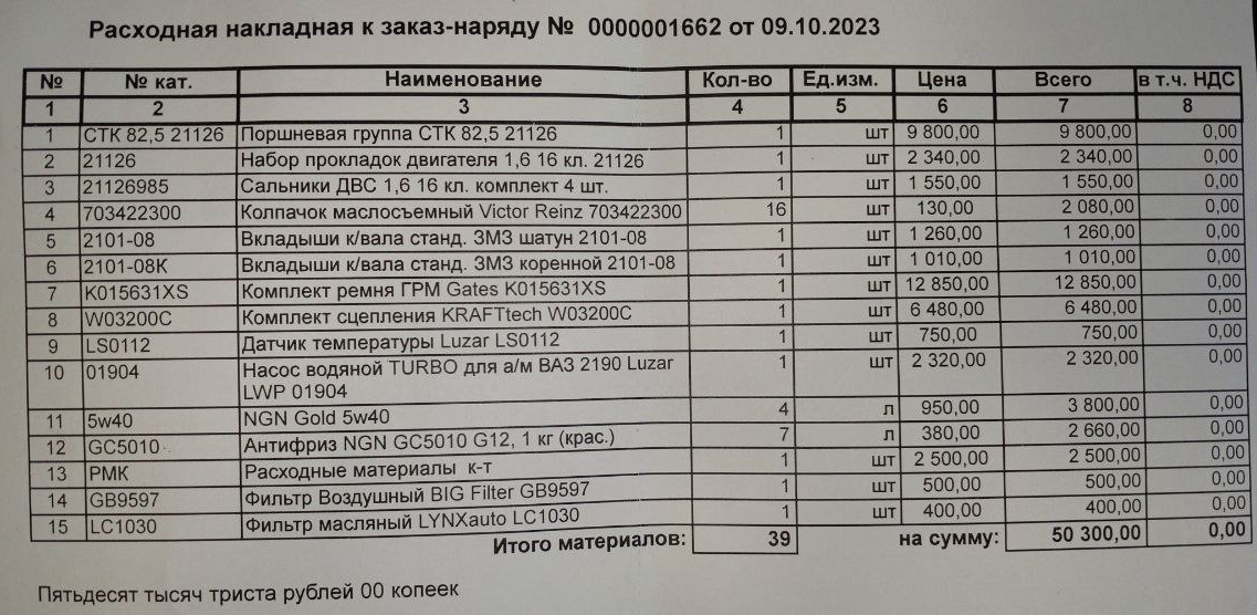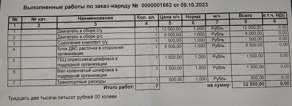 Запчасти и расточка вышли на 30к. Снимал мотор сам, возил на расточку сам. На сборку привёз все комплектующие в багажнике авто. Сам автомобиль доставил эвакуатором.