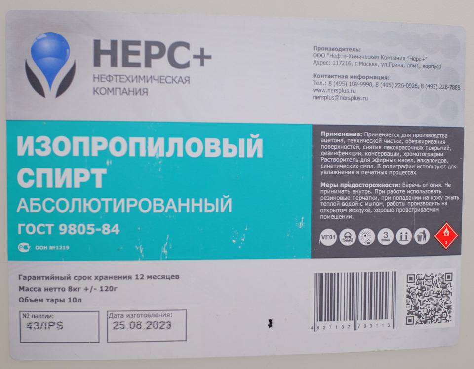 Взял 10л (десять литров), что составляет 8кг (восемь килограммов). Цена в рознице — в пределах 1570 рублей за 10л. Проверил канистру на весах. Получил 8,2 кг. Отбросим вес тары, получаем цифру, очень похожую на вес абсолютированного спирта.