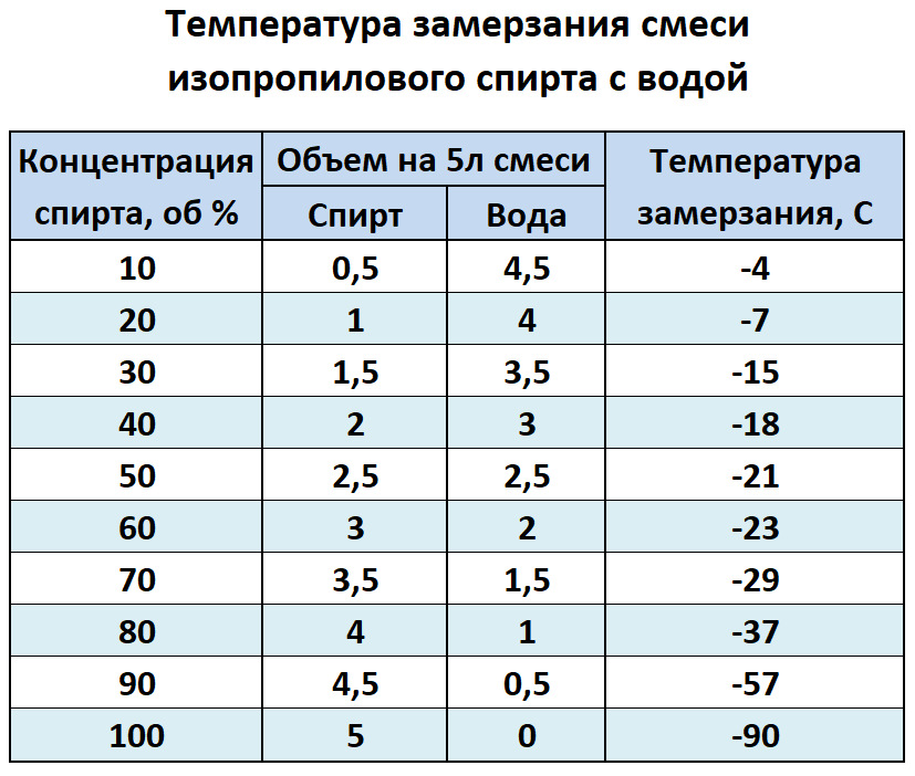 В этом году опять закупился изопропиловым спиртом. Для удобства дополнил таблицу пропорциями на 5 литров смеси.