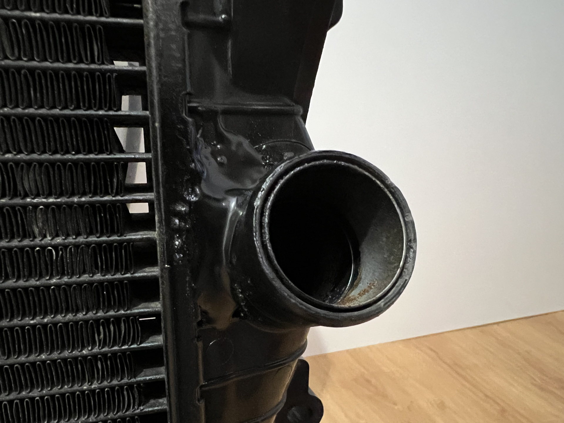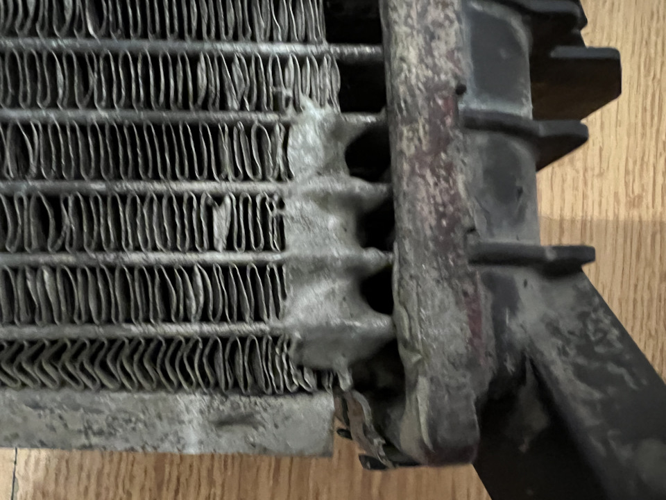Вы знаете, я когда впервые увидел этот радиатор, первый вопрос, который у меня возник, а на кой хрен они сделали вход под углом, почему внизу по человечески, а верх под углом. Как ни крути но усилие от патрубка идёт на излом, и характер трещины об этом прямо говорит. Какая такая была в таком способе крепления необходимость. Я понимаю что ничего не вечно, но есть вещи, которые стоило бы делать долговечными по максимуму.