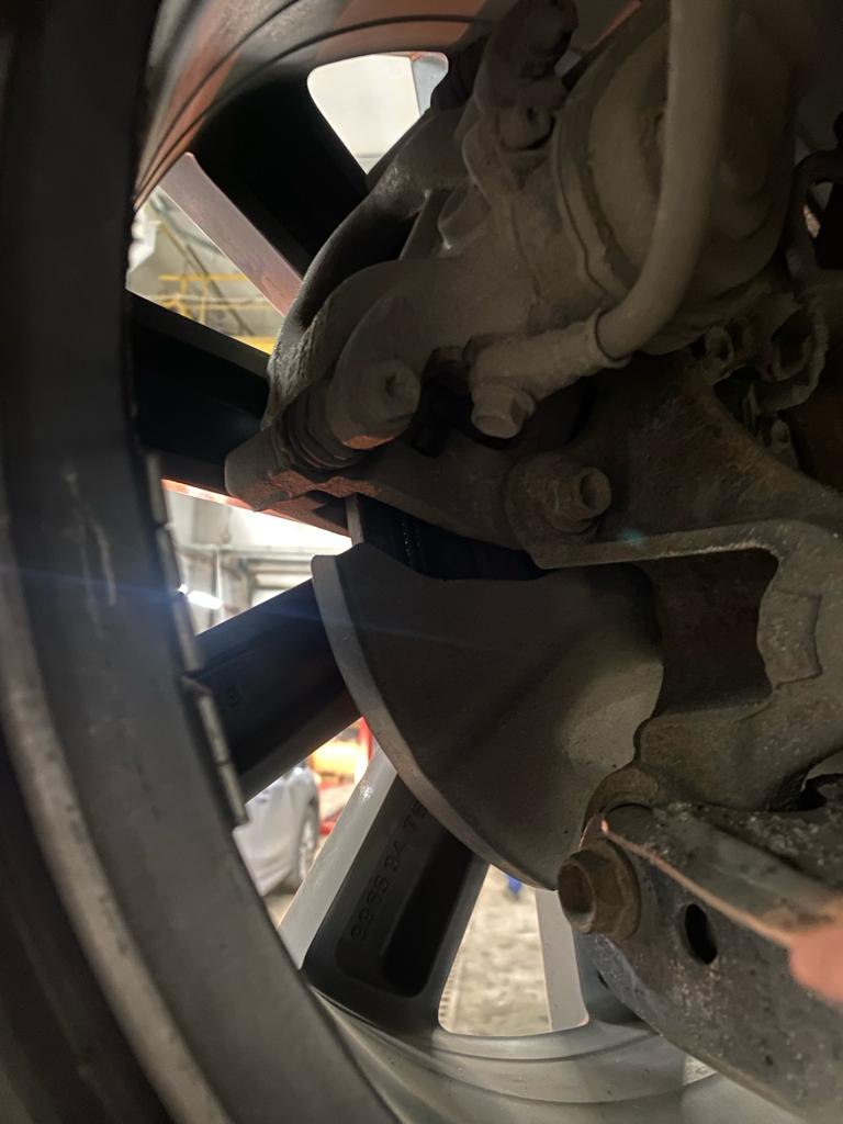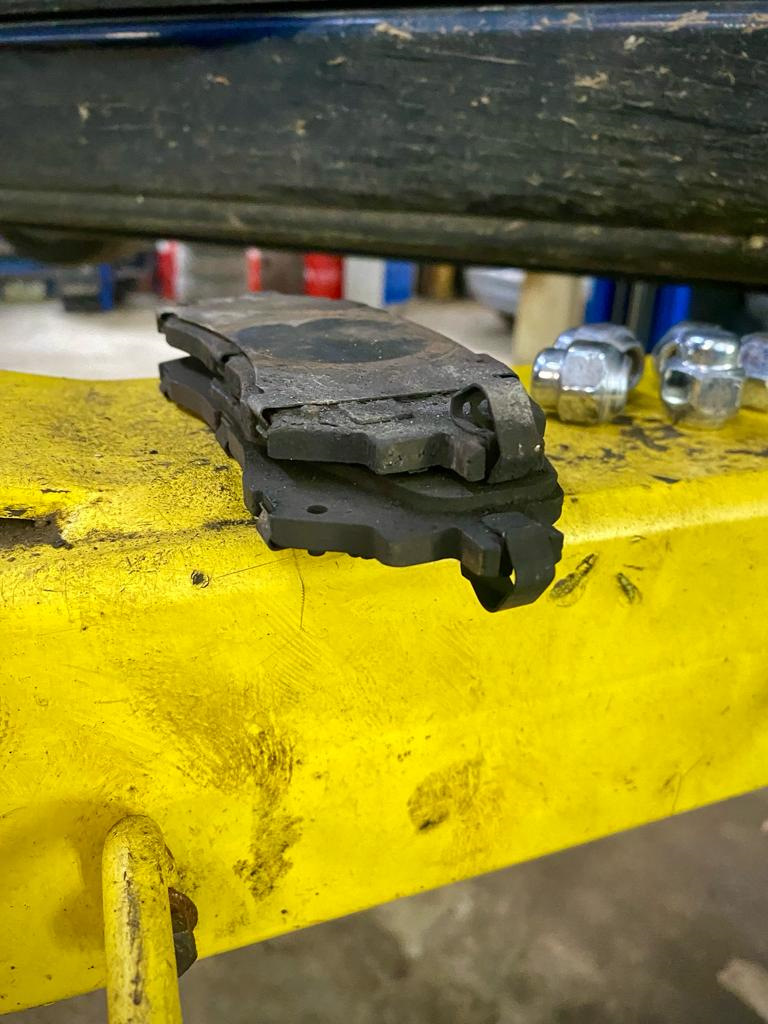 Износ колодок на фото… оригинальные колодки скатались в ноль за 30т.км, хотя еще хороший результат!