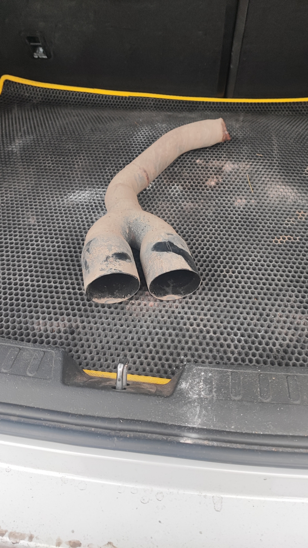 Короче, подходя к машине сзади я заметил что выхлоп слева висит ниже. Пошевелил его и понял — он скоро отвалится. Дожидаться этого не стал, отломил до конца сам 😂 Дело в том что три года назад выхлоп перекраивали, выводили под бампер. Видимо надо было после сварки сварные швы покрасить, а чего то пробакланил, и вот результат — отгнило ровно по шву. Сижу вот теперь, репу чешу, думаю как поступить. Вернуть как было или убрать и вторую двустволку? А может оставить как сейчас? Что скажете, драйвовчане — как лучше поступить?