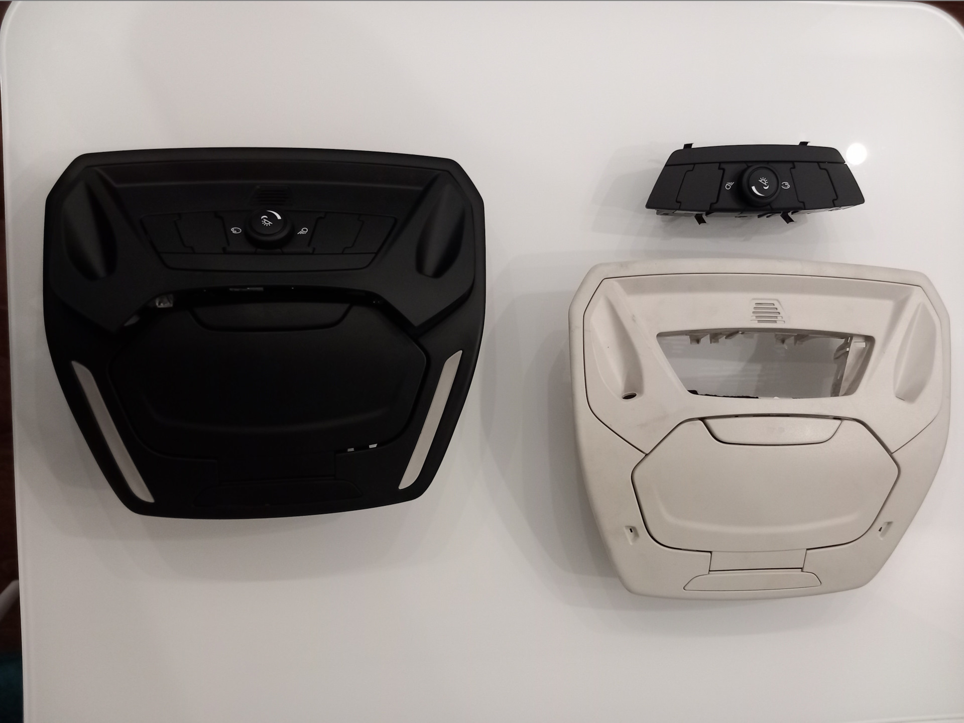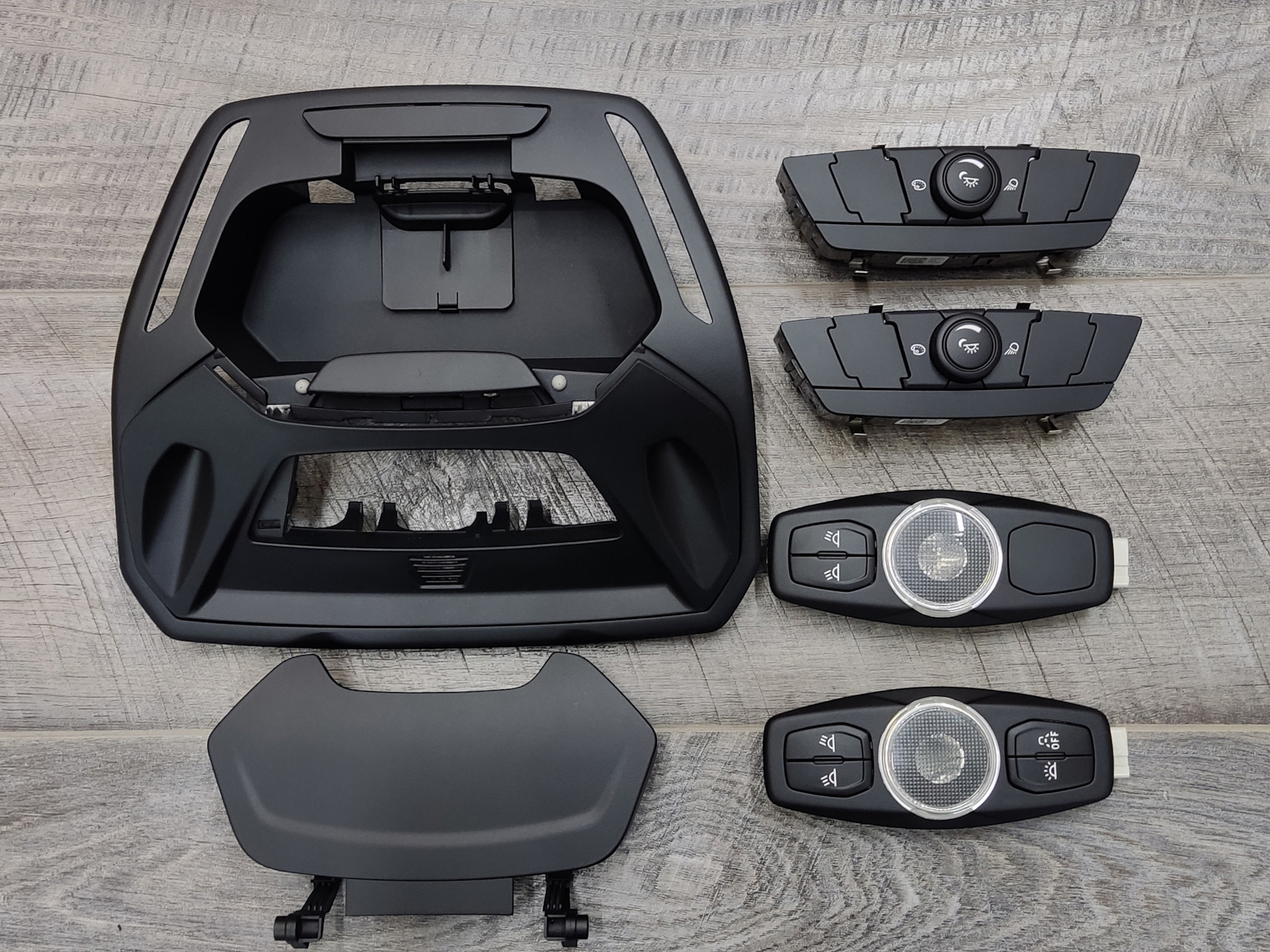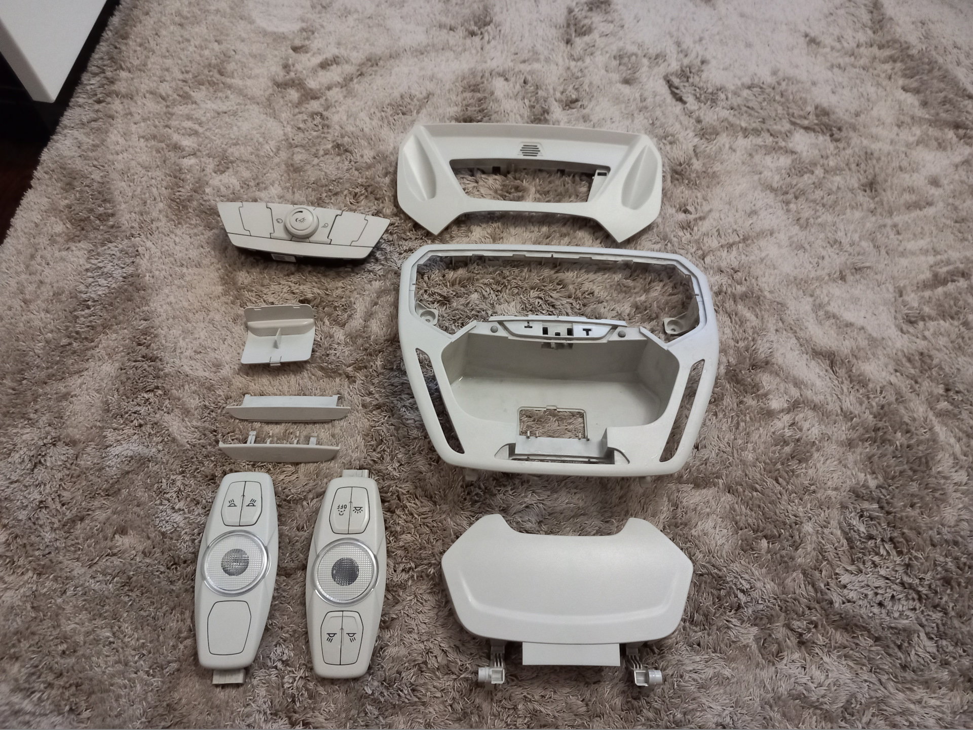 Найти черные плафоны не удалось в РФ, тащить из Польши за 8 т.р. один плафон и за 6 т.р. другой не стал. Черный очечник именно от фокуса не нашел нигде (был один вариант только в сборе с черным потолком на универсал за 50 т.р. без доставки при условии, что потолок весь заломан) ( в РФ есть несколько вариантов от Куги). Поэтому было принято решение покупать белые и отправлять elgr на перекрас и гравировку рисунка кнопок. Для этого были приобретены 2 белых плафона от титаниума по 1000 рублей, также был приобретен полный комплект многоцветной подсветки с очечником от дореста (он мне больше нравится, чем рестайлинг – отличия в прорезях подсветки). Отправил Егору – пару недель мучительного ожидания и заветная посылка с недостающими деталями у меня в руках – сказать, что доволен качеством – ничего не сказать – просто заводское исполнение!