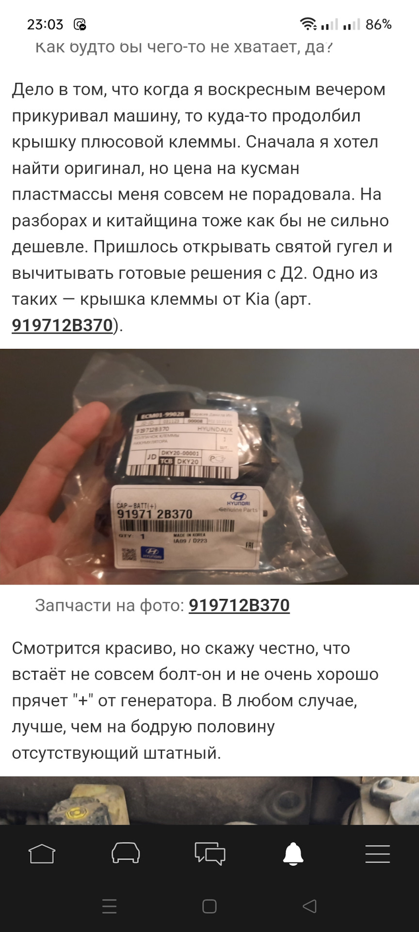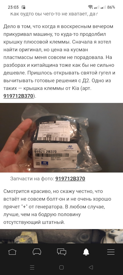 Дело в том, что когда я воскресным вечером прикуривал машину, то куда-то продолбил крышку плюсовой клеммы. Сначала я хотел найти оригинал, но цена на кусман пластмассы меня совсем не порадовала. На разборах и китайщина тоже как бы не сильно дешевле. Пришлось открывать святой гугел и вычитывать готовые решения с Д2. Одно из таких — крышка клеммы от Kia (арт. 919712B370).