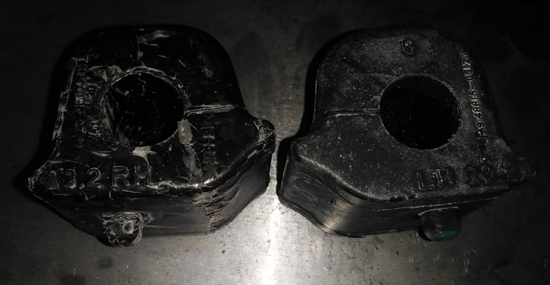 При демонтаже втулок стабилизатора выявлены разрывы пылезащитных уплотнений, из-за чего грязь попадала во внутреннюю часть втулок и вызвала износ. На стойке стабилизатора обнаружен надрыв резинового пыльника нижнего пальца. Процесс замены втулок и стоек описан много раз, повторяться не буду.