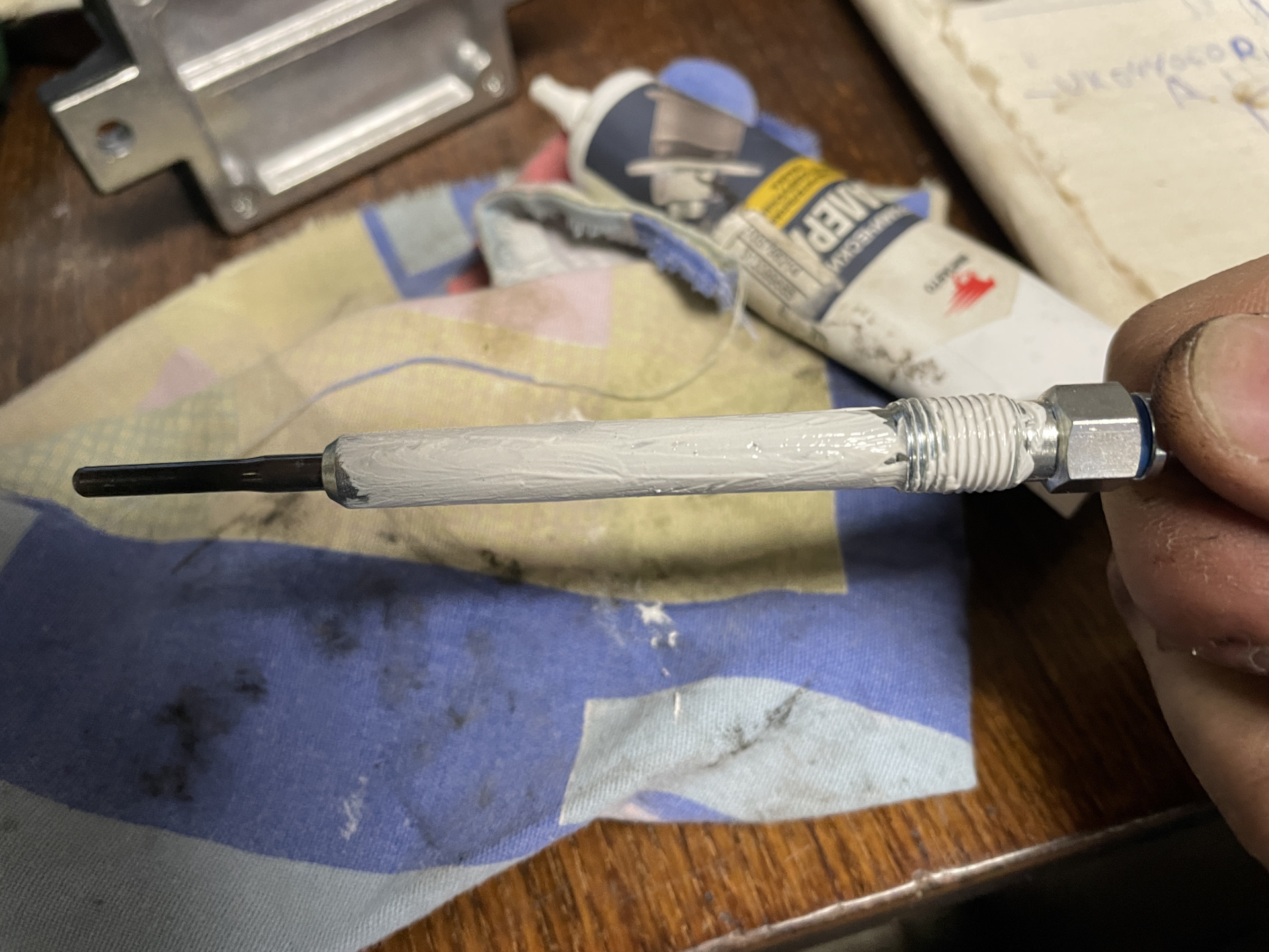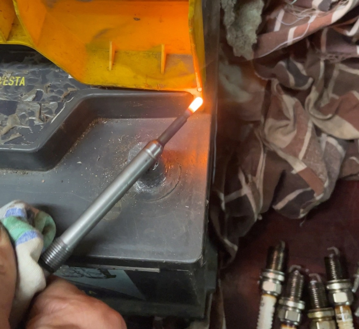 Церемониться с ними не стал. Прикручиваю провод на плюс и кладу свечку на минус. 3 мертвые свечи СОВСЕМ. Единственная живая, засветилась спустя 4 секунды.