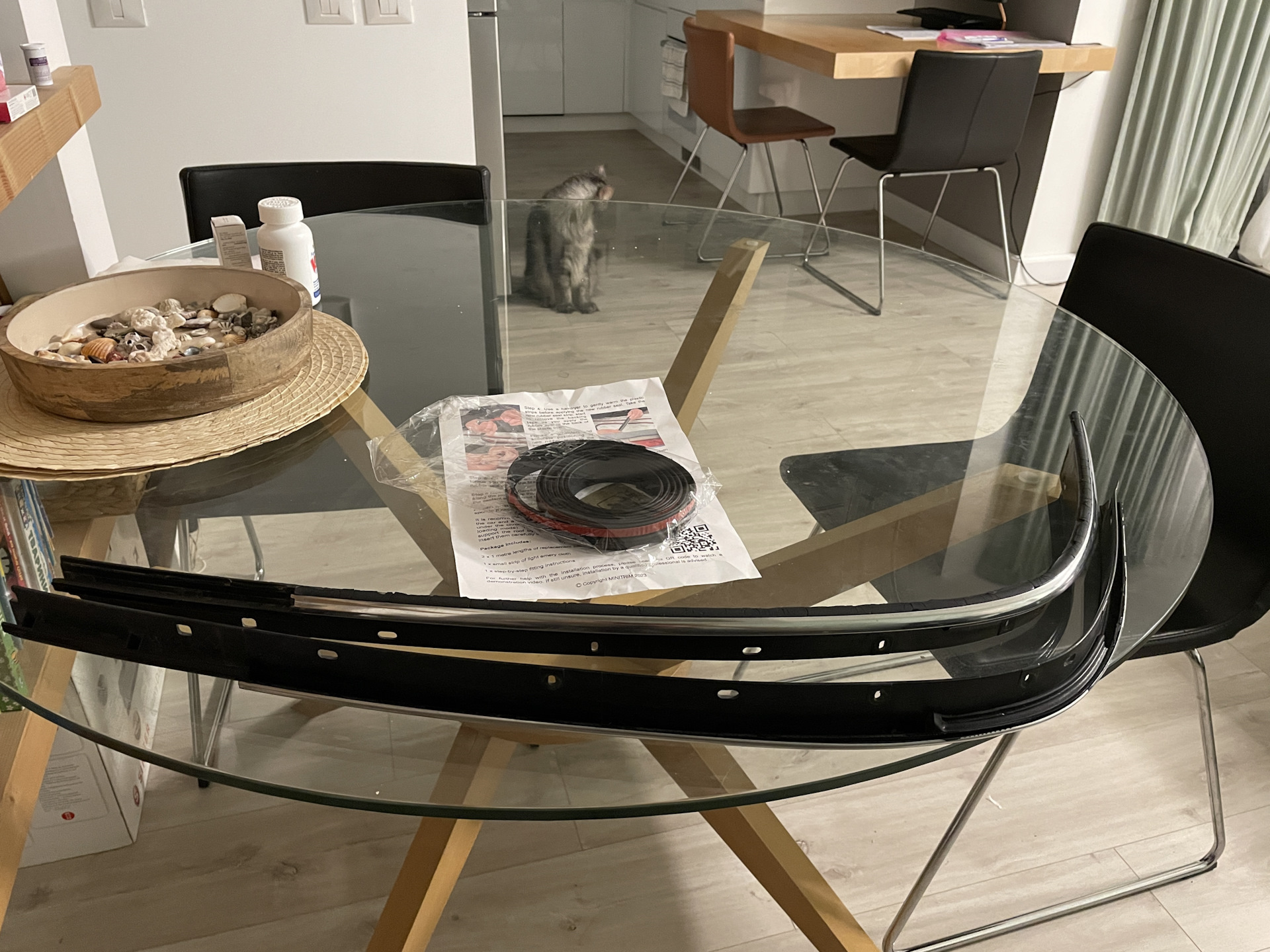 Готовый результат. Они еще советуют промазать черным герметиком для вклеивания стекол стык резинки и верхней части этого молдинга, чтобы заделать трещины в оставшейся резинке на верхней поверхности молдинга (отколупывать ее не надо, а то весь молдинг развалится). Такого герметика у меня нет, поэтому пока поезжу без финального штриха.