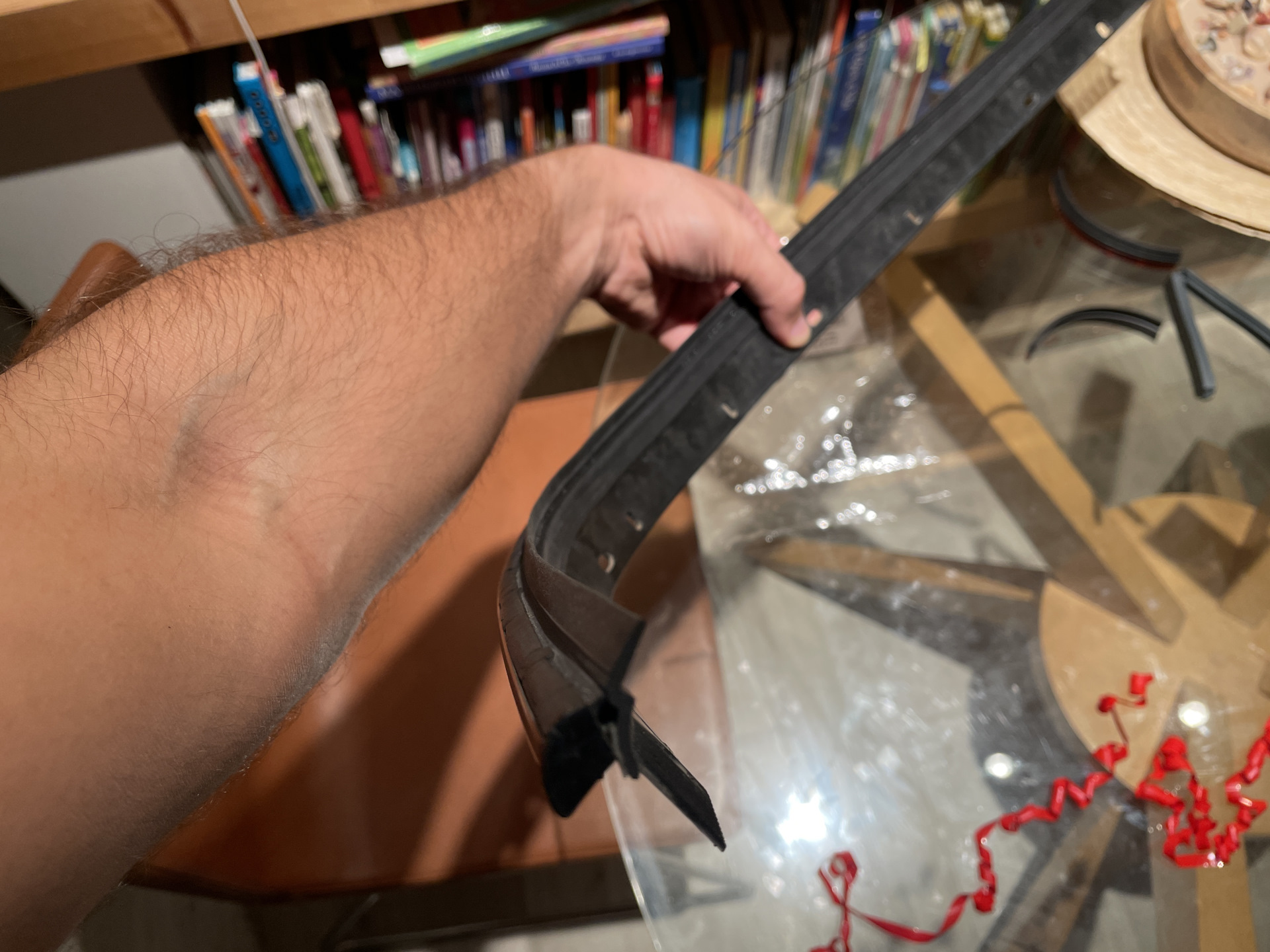 Примеряем резинку, потом промываем вайт-спиритом пластик, зашкуриваем его мелкой наждачкой, а потом греем феном поверхность и сразу клеим резиновый уплотнитель (я по 10 см продвигался, так как нагреть больше не получалось — остывало)