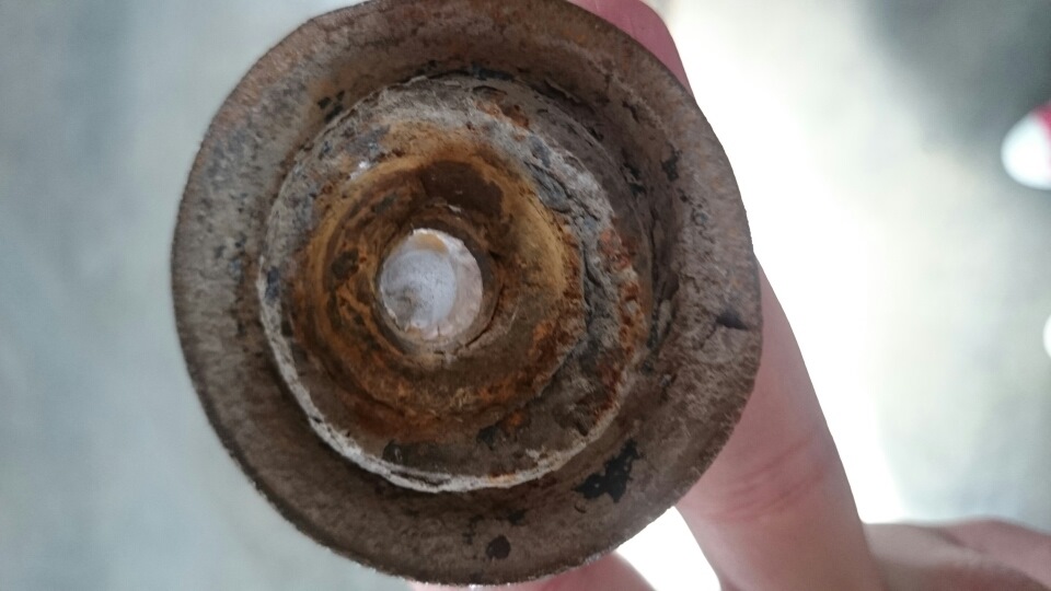 Не прошло и полгода, как меняла задние тяги и делала сход развал, как попа опять поплыла и появился глухой стук сзади. Сегодня просмотрели всё, тяги Феби пришли в негодность, а еще нашли причину стука — опора подрамника когда-то кем-то как-то была поставлена неправильно, а именно, тарелочкой наверх, а не вниз. И эта тарелочка как раз и стучала. И почему-то оно ещё и прикипело так, что при откручивании тупо сломалось. Сей артефакт и запечатлен на фото :-) Зато не стучит теперь!