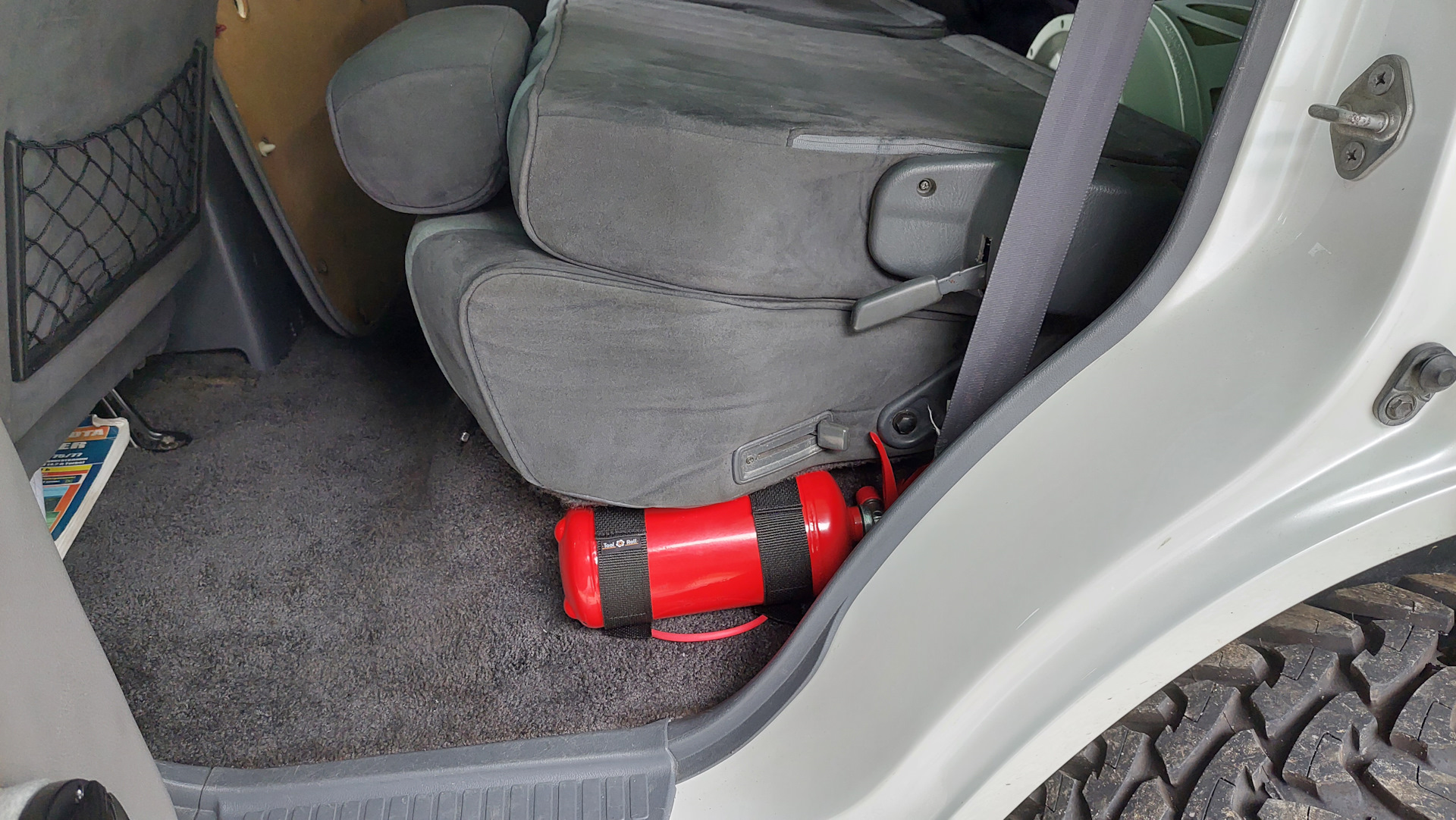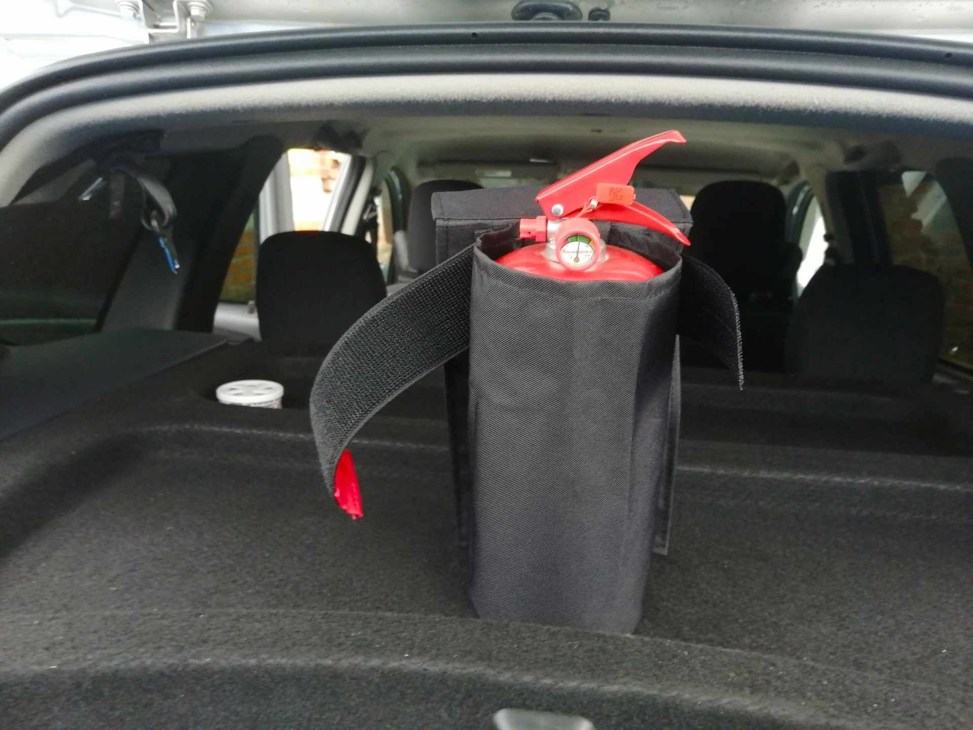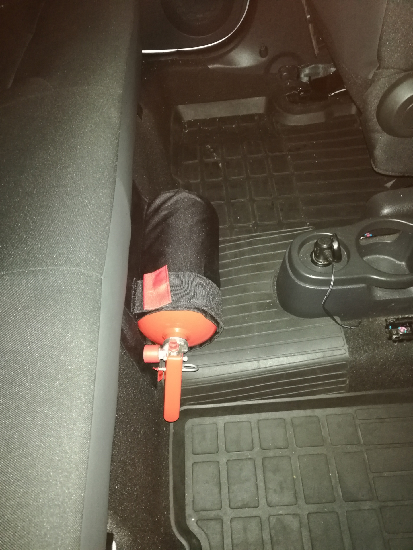 Сел сзади, прикинул, даже если сзади будут сидеть 2 человека, то огнетушитель мешать не будет, а в нашем случае и подавно, сзади вообще никто никогда не ездит