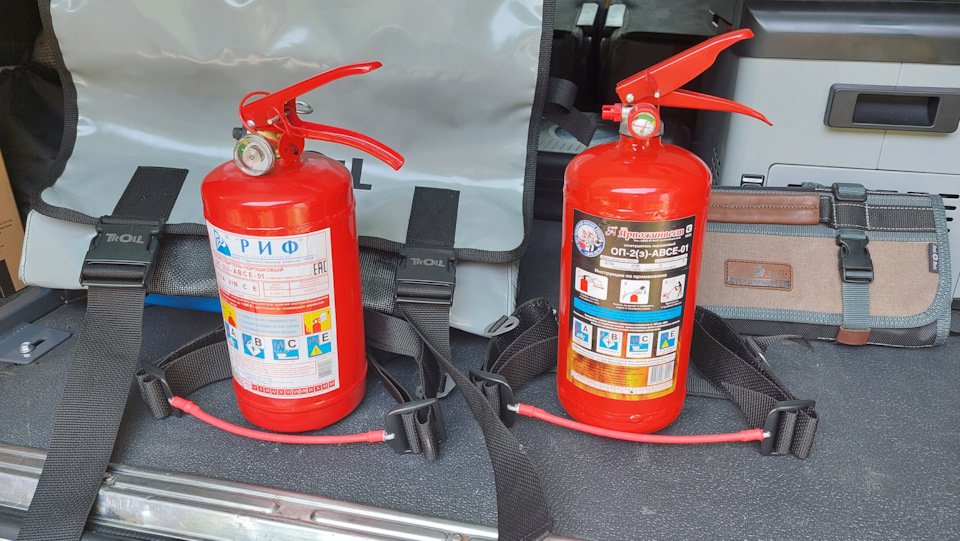 Взял специальный держатель для огнетушителей — ремни, которые можно закрепить на чем угодно, а в случае надобности — дёргаешь за красный трос и огнетушитель выпадывает тебе в руки.