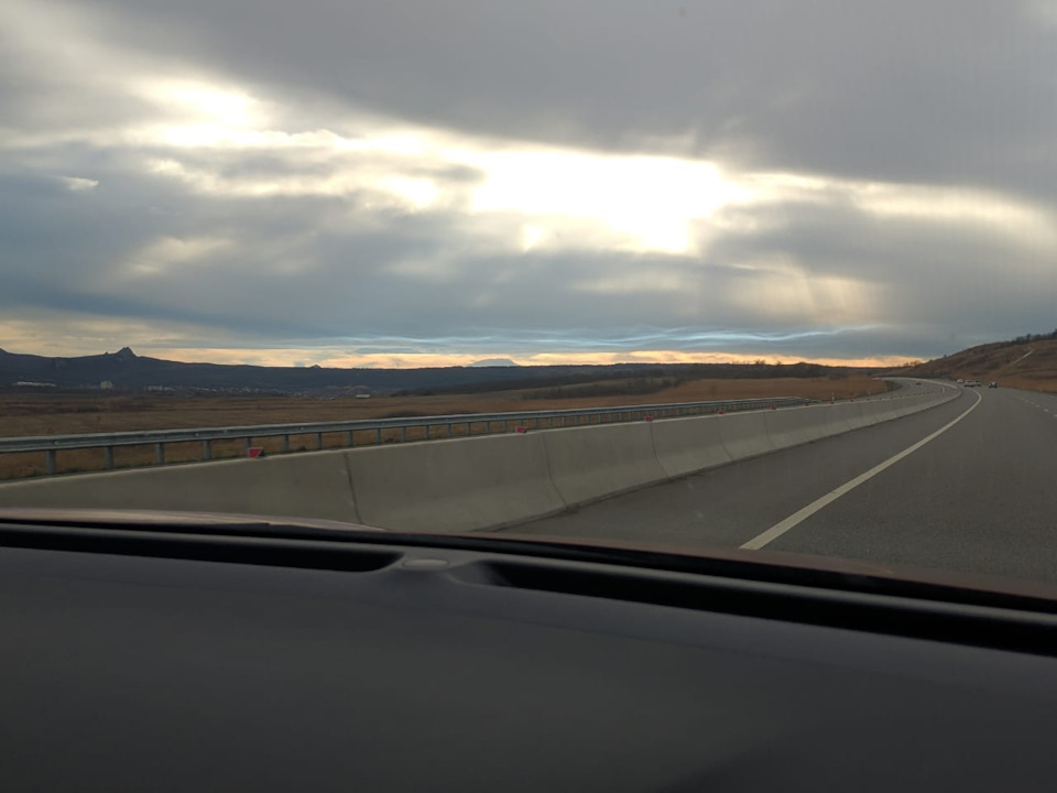 Зима… гляди вон, как сегодня было… На мобилку не снимешь на скорости особо. Большой Кавказский- крупно видно. И Эльбрус весь, как одеялом по контуру накрыт. И вот такие разводы…