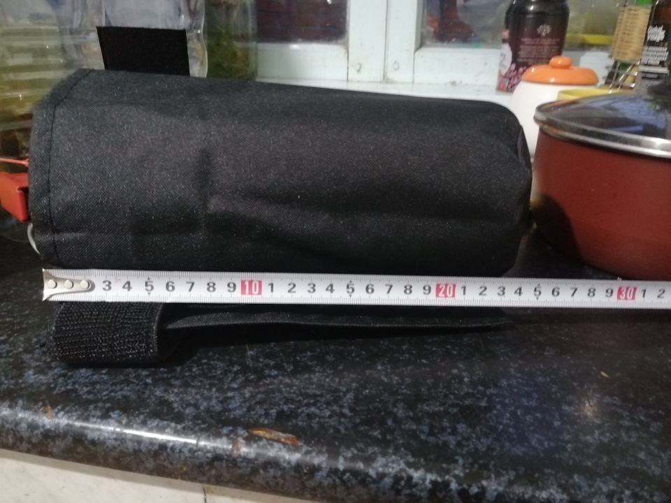 Сверху сумки сделан ремешок в виде плотной резинки, затянул, пристегнул на липучку и всё, баллон надёжно закреплён