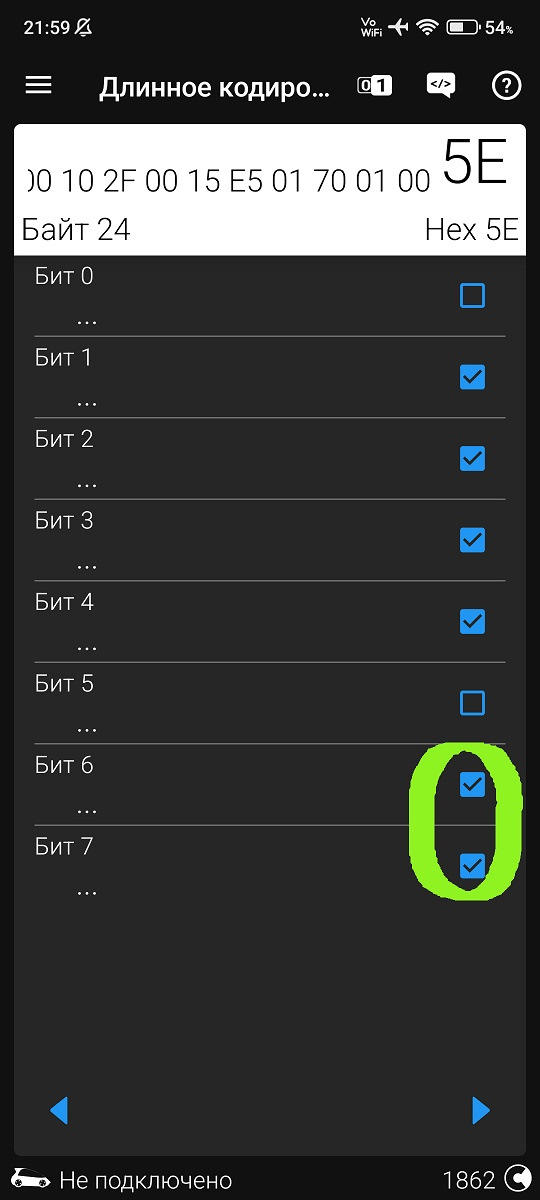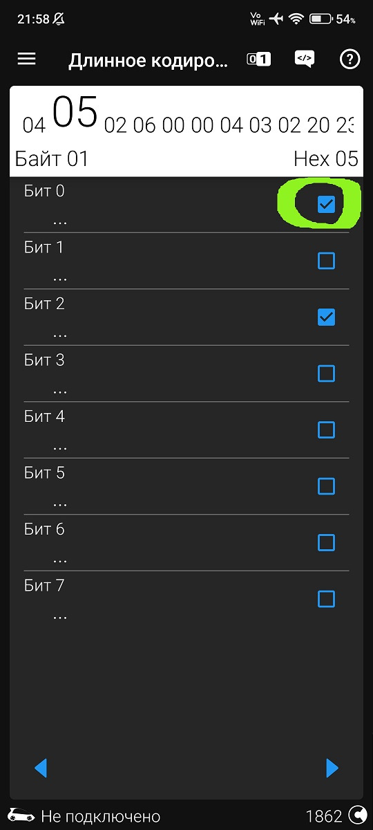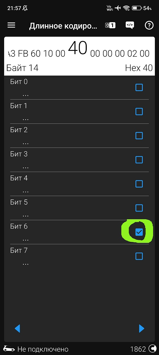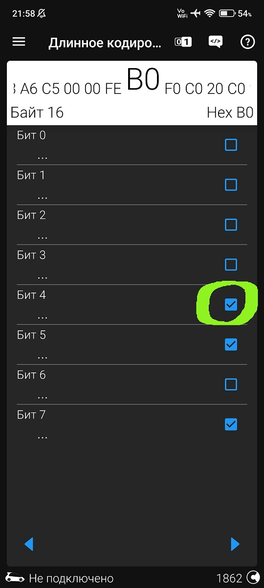 Заходим в блок 17 (Dashboard), далее Длинное кодирование, далее активируем “Byte 14 Bit 6”