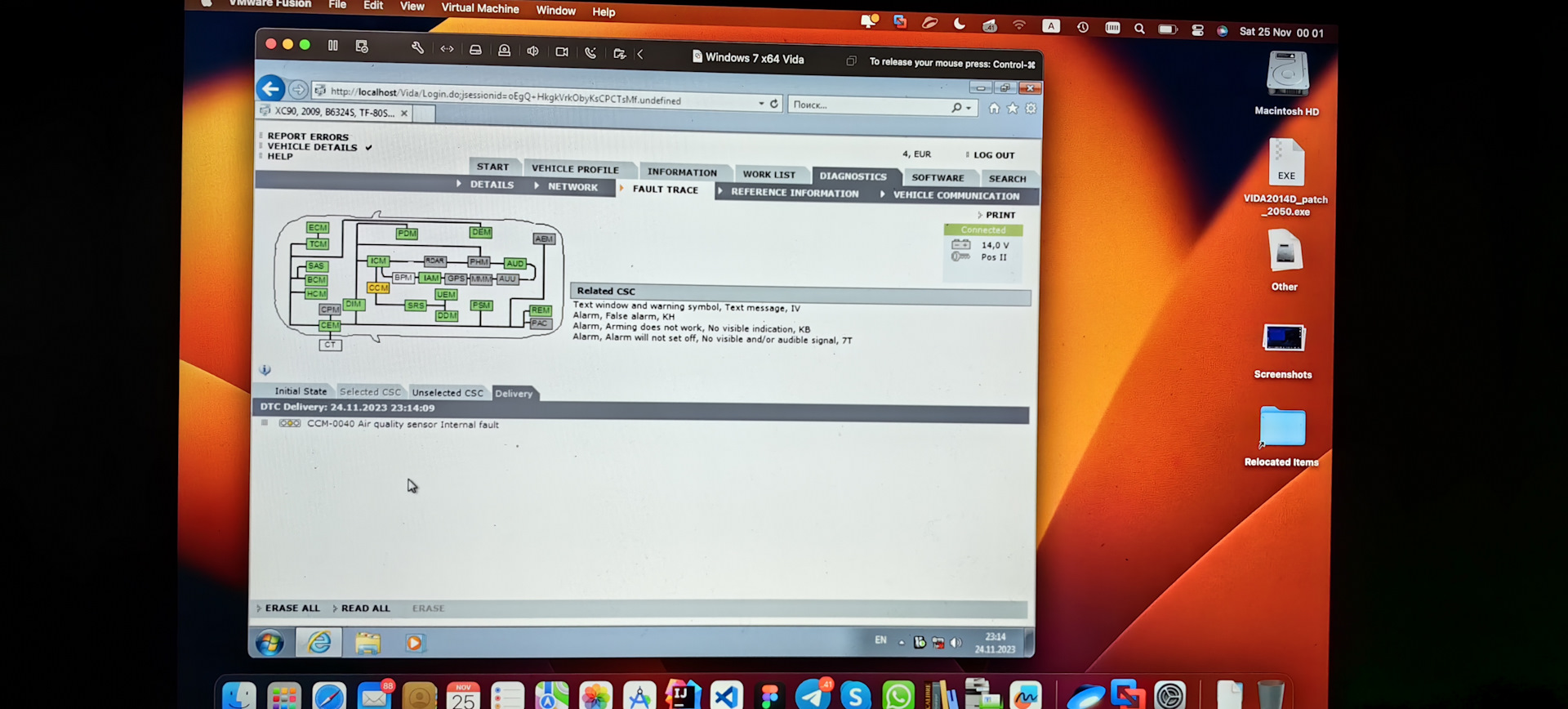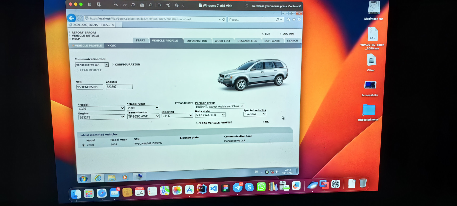 Мне дали ссылку на статью, как все устанавливать и откуда можно скачать образ уже установленной системы с видой. Проверил на рабочем компе, VmWare запустил, проверил кабель, ну думаю сейчас залью на ноут и вперед в машину. Ага, вот так если бы все просто… У меня MacBook на Intel, скачал VmWare Fusion, скормил ему скачанный образ, и все… Что-то при создании образа было сделано не так, потому что винда в нем уходила в ребут. После началось любимое дело всех программистов и айтишников, а именно танцы с бубном. Пытался конвертировать образ на рабочем компе до 11-ой версии винды, не взял, пытался создавать на ноуте новую систему с 11-ой виндой, но тут уже вида отказалась устанавливаться сначала на просто 11-ой, потом именно на 64-битной. Плюнул на это дело. Скачал 7 винду. Начал по новой создавать образ, потом установил виду, скачал драйвер для мангуста отсюда и вот заработало. Пошел в машину, подключился,