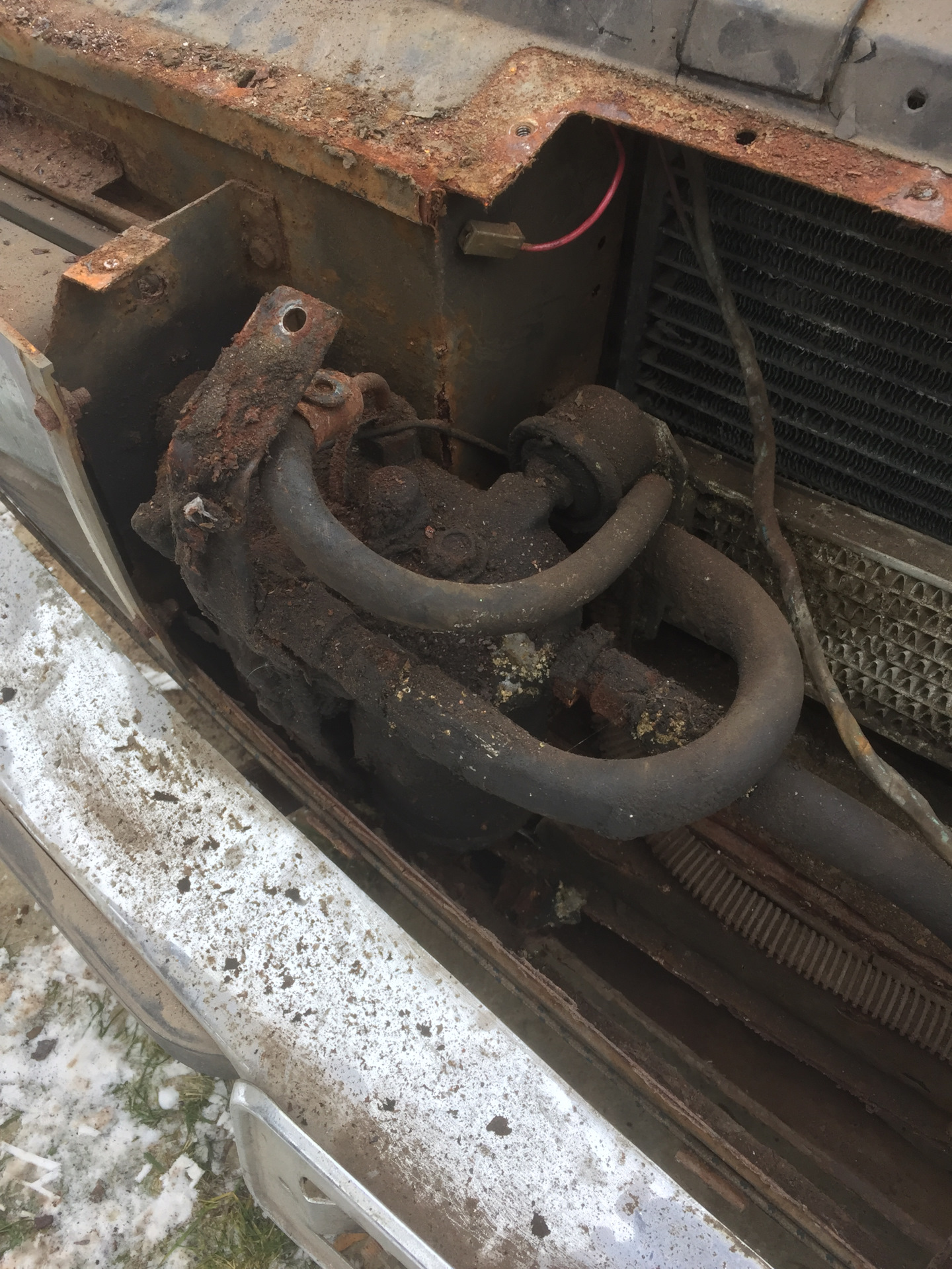 Теперь о комплектации. На машине, которая мне досталась, было все, за исключением, казалось бы, мелочи — отсутствовал оригинальный масляный фильтр. Вместо него был колхозно установлен фильтр от газ-14 за решеткой радиатора.