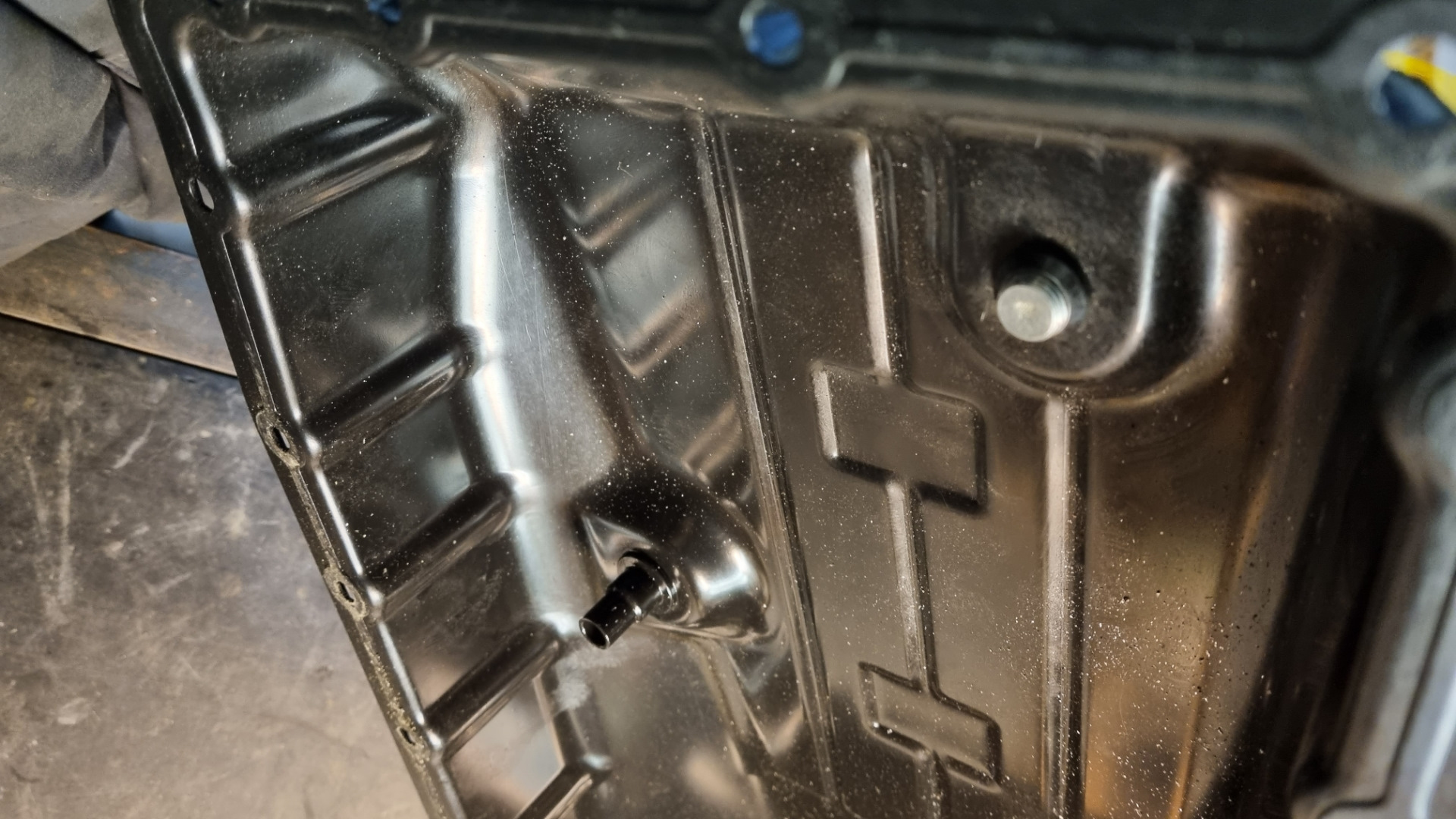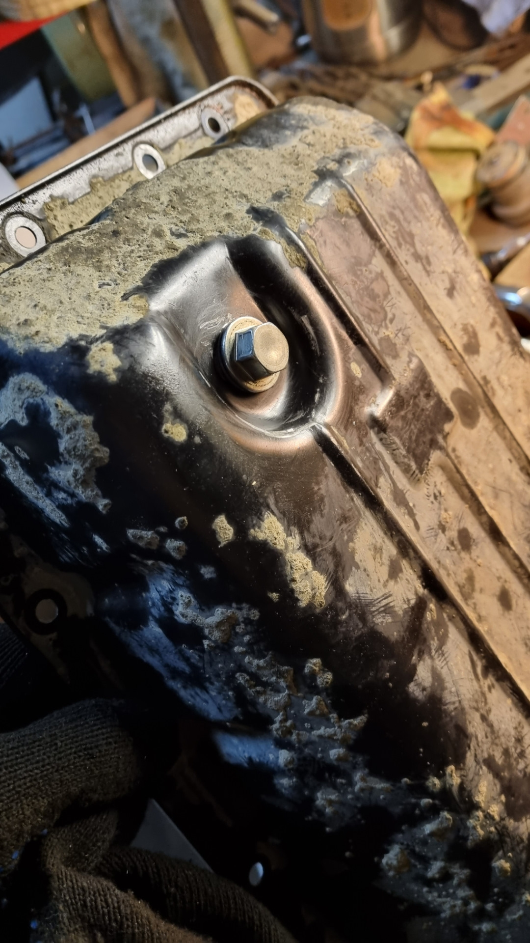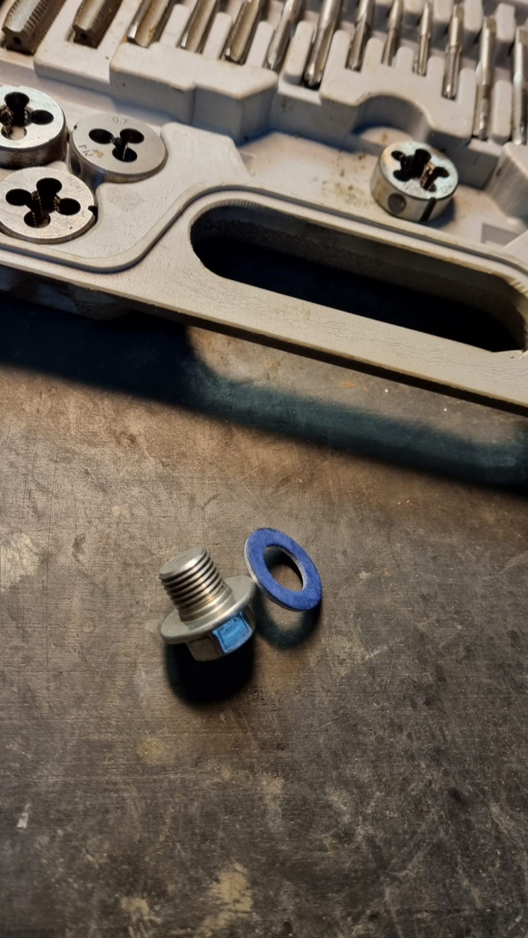 После того как слил старое масло, закручивал сливную пробку и видимо перестарался. Сорвал резьбу, стал выкручивать обратно, а она нивкакую. Пришлось высверливать старую пробку, нарезать новую резьбу и ставить сливную пробку от масляного поддона двигателя.