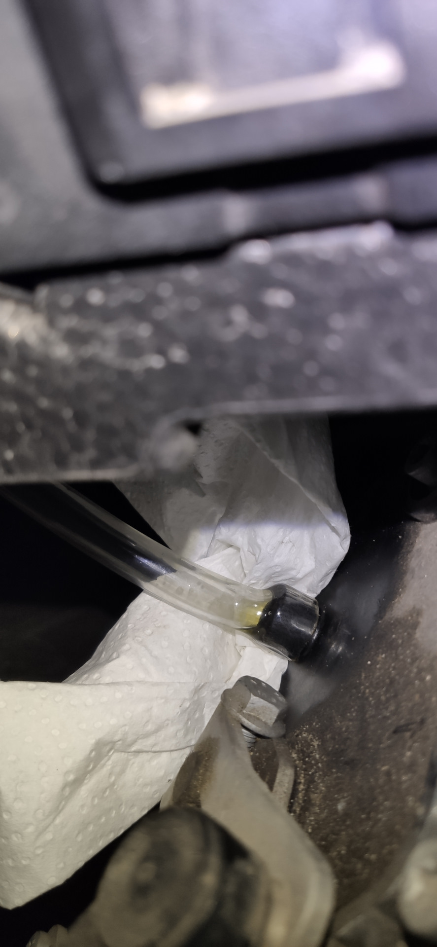 Теперь необходимо накинуть на него трубку, для этого подогрел зажигалкой край шланга, и натянул на сапун. На всякий случай, положил бумажную салфетку, что бы в случае чего увидеть не заливаю ли я мимо.