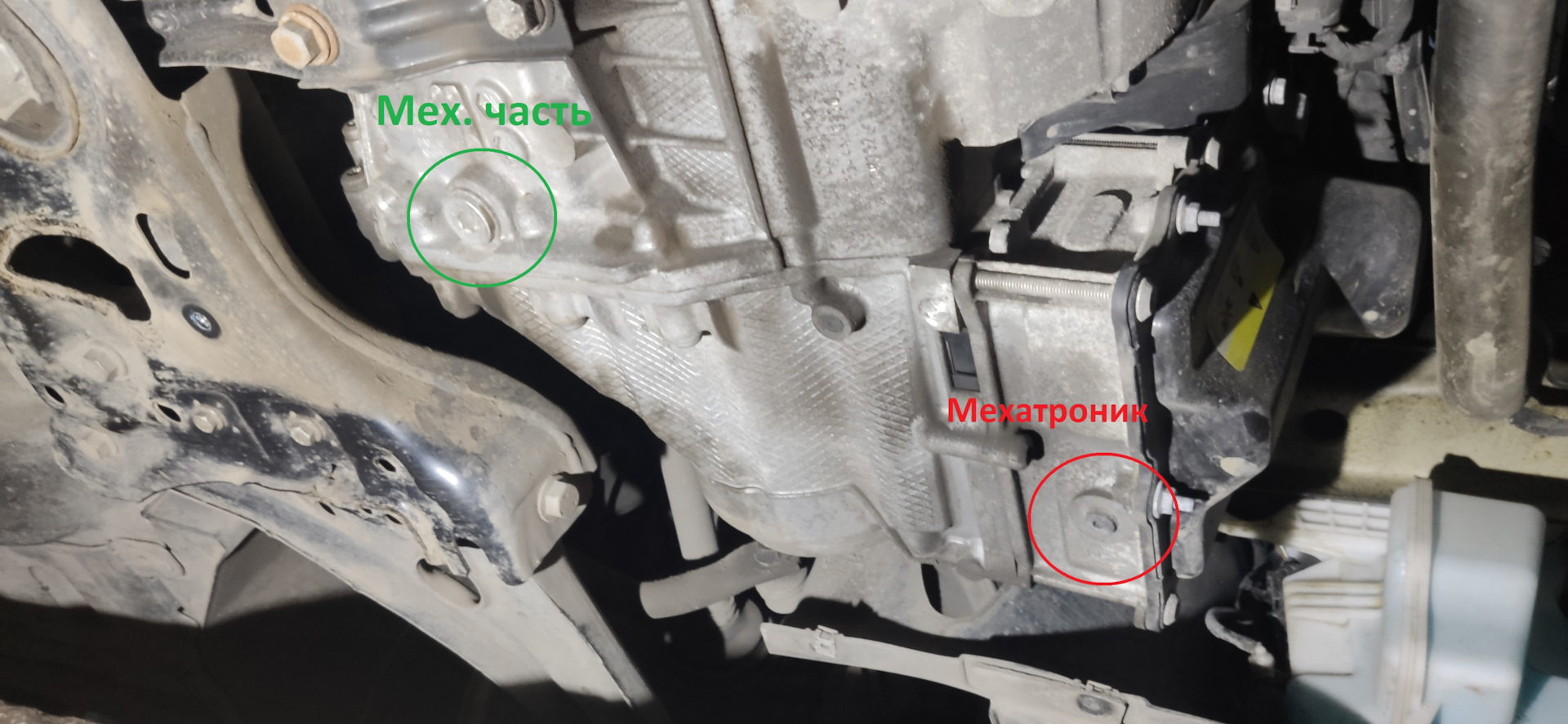 1. Машина горячая, залетаем в гараж. Скидываем защиту двигателя. Откручиваем сливную пробку механической части коробки ( дальняя пробка . Важно не перепутать и не открутить пробку мехатроника( расположена ближе к морде машины)