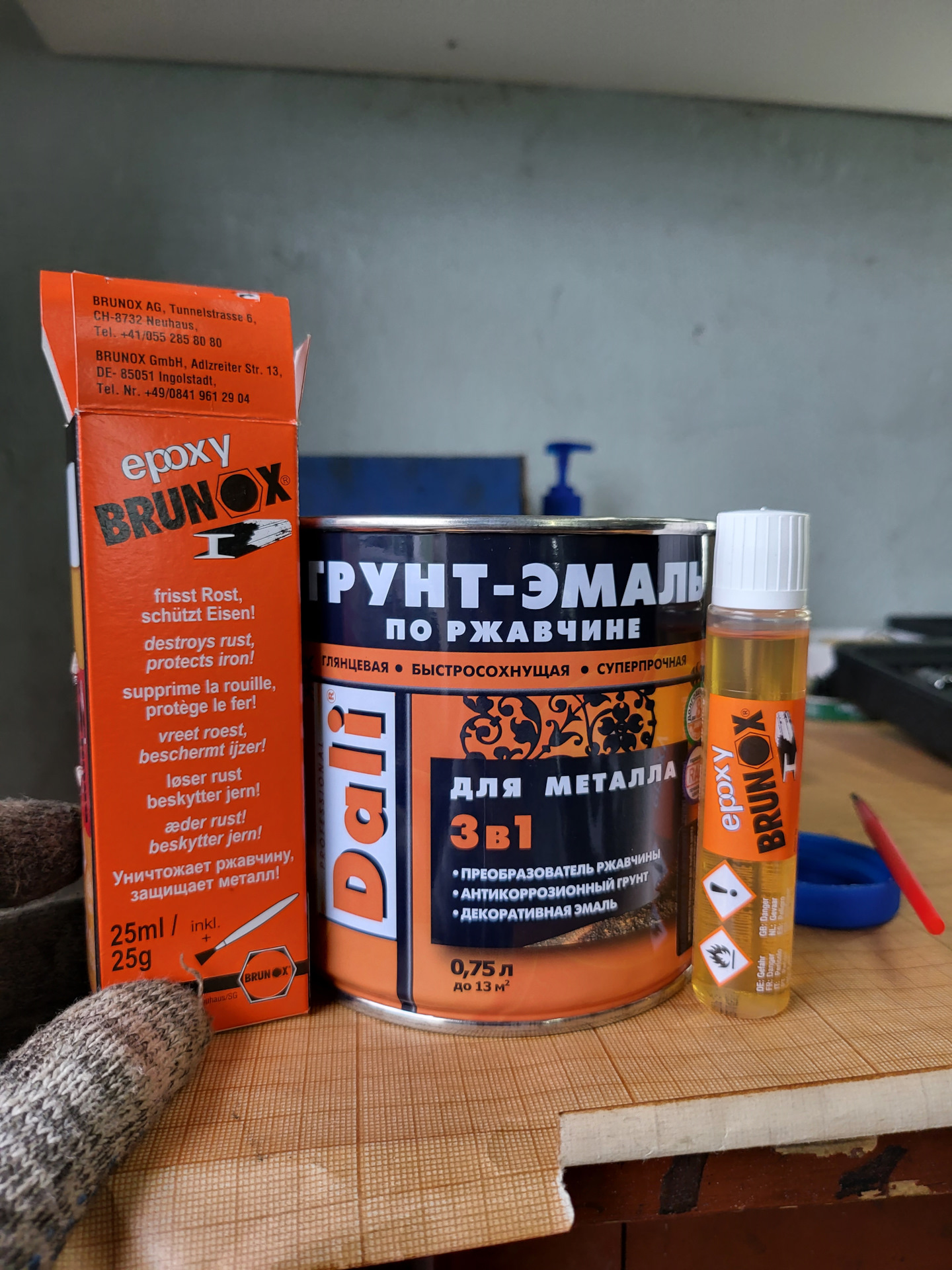 Уверен, маляры с опытом сейчас снова закидают помидорами, но вот такой набор я купил в строительном магазине для самостоятельного ремонта зон, скрытых от глаз. Brunox — это преобразователь ржавчины на основе эпоксидных смол, образующий толстый слой-грунт. Решил попробовать, так как мне понравилась тара по объему: как раз для мелких сколов и ремонтов. Что касается краски — просто черный глянец от фирмы Dali. Ранее красил ворота гаража хаммерайтом от этой фирмы. Быстросохнущая и очень хорошо сама выравнивается после нанесения валиком или кистью.