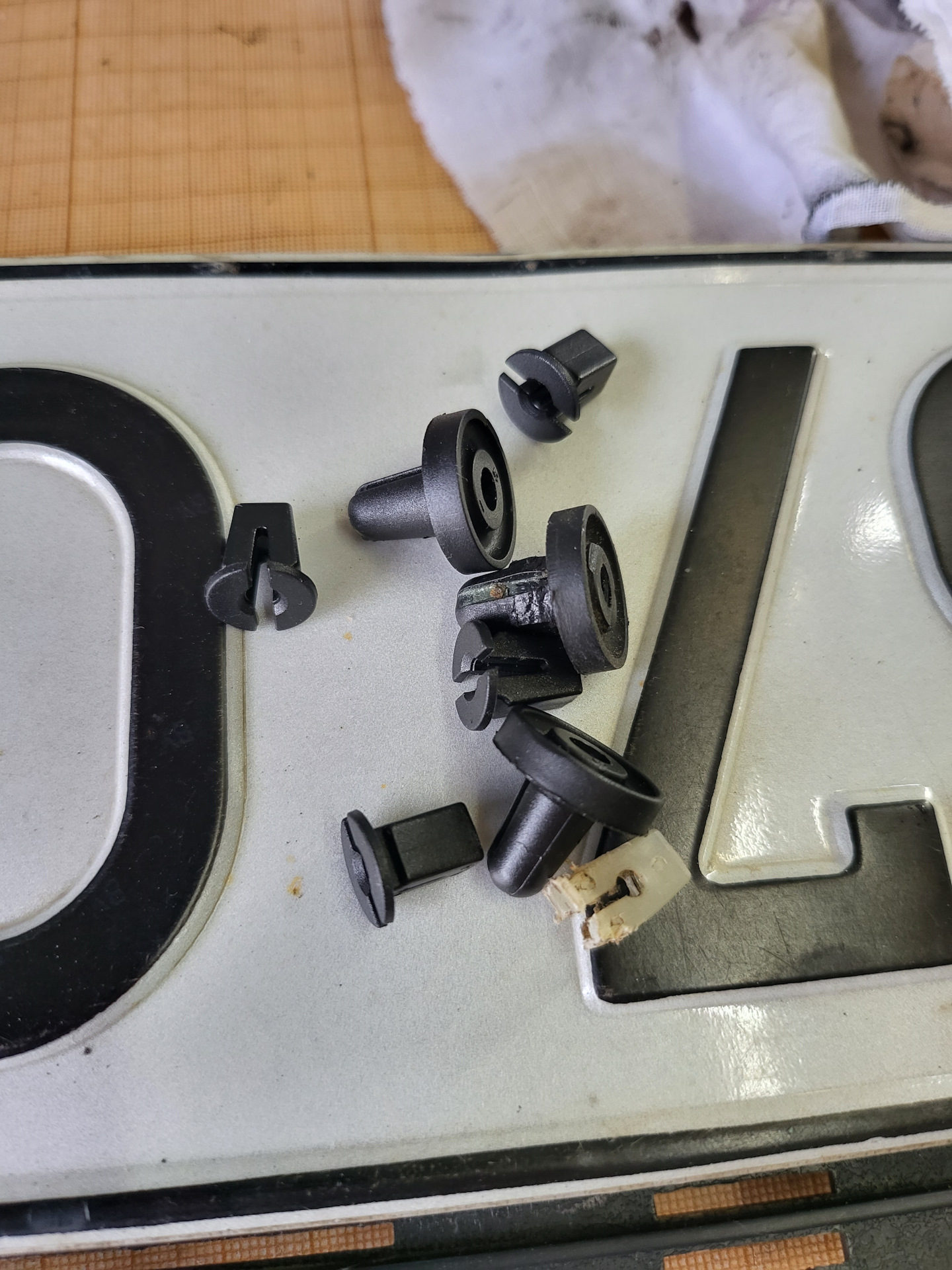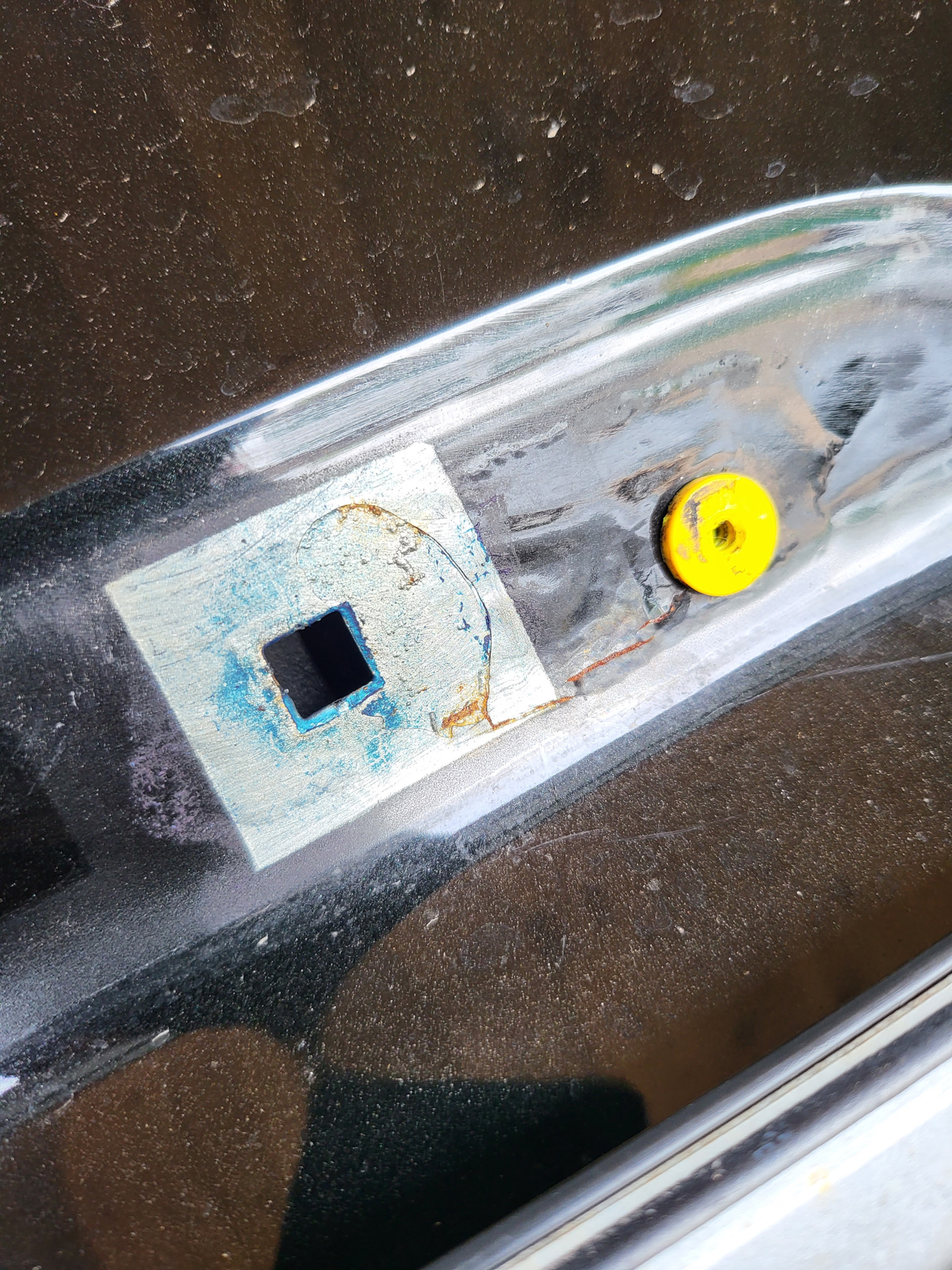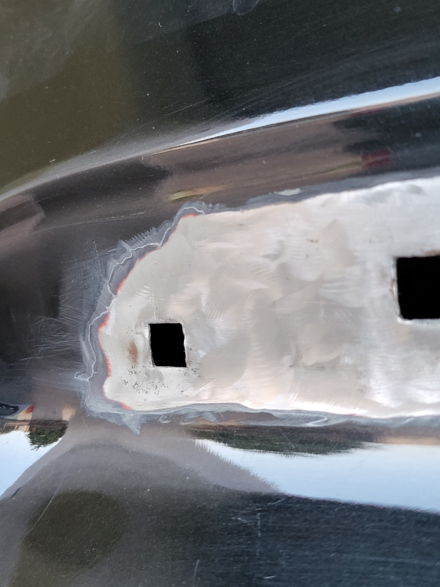 Выдрал какие-то непонятные пистоны, и по проверенной схеме начал зачищать металл до чистого состояния наждачными кружками на дремеле. Дочистил до того места, где краска уже нормально держится. К счастью, не вылез за пределы зоны, которую перекрывает планка подсветки номера.