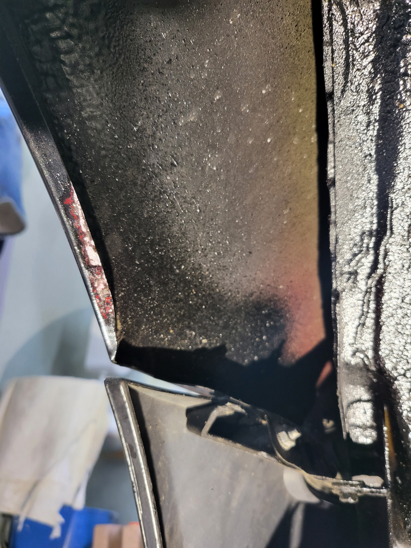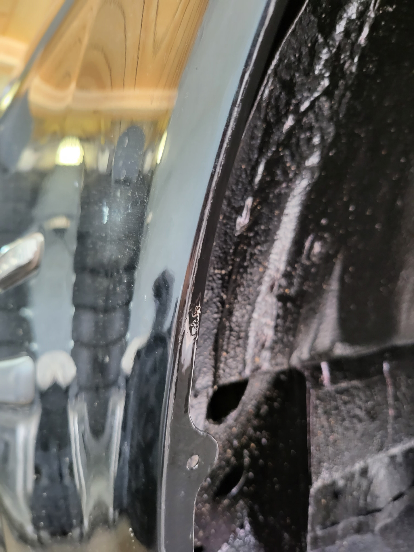 На канте передних крыльев я нашел несколько пузырьков, несмотря на то, что с моменты их замены и покраски прошел всего год. Поэтому перед тем, как ставить подкрылки, я решил подлечить эти места с обеих сторон.