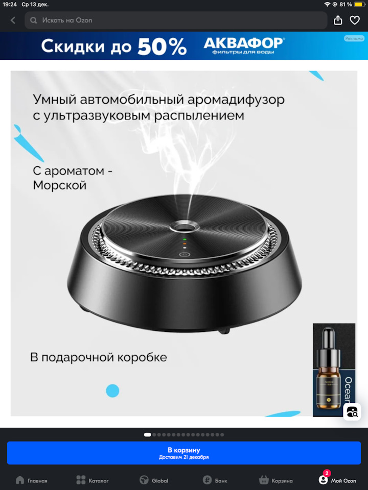 Увидел я тут в СберМаркете вот такую штуку, положил в корзину и забыл. Цена в 2600, как-то не радовала. А тут вдруг промокод на скидку и я решил заказать. Упаковка, я вам скажу, подарочная, а внутри набор джентльмена. Три вида духов. Принцип работы такой, что прибор сам распыляет, а тебе остаëться только нюхать. Два режима, с интервалом, может работать постоянно, можно в ручную. Описывать подробно не буду, если кому интересно, то вот ссылка. На Озоне дешевле чем на сбере: Ультразвуковой автомобильный ароматизатор Aroma-Black AM2BD: megamarket.ru/catalog/det…black-am2bd-600014143797/ Скоро конец гарантии, в январе пройду ТО 6 и ухожу в свободное плавание. Ну как-то так.