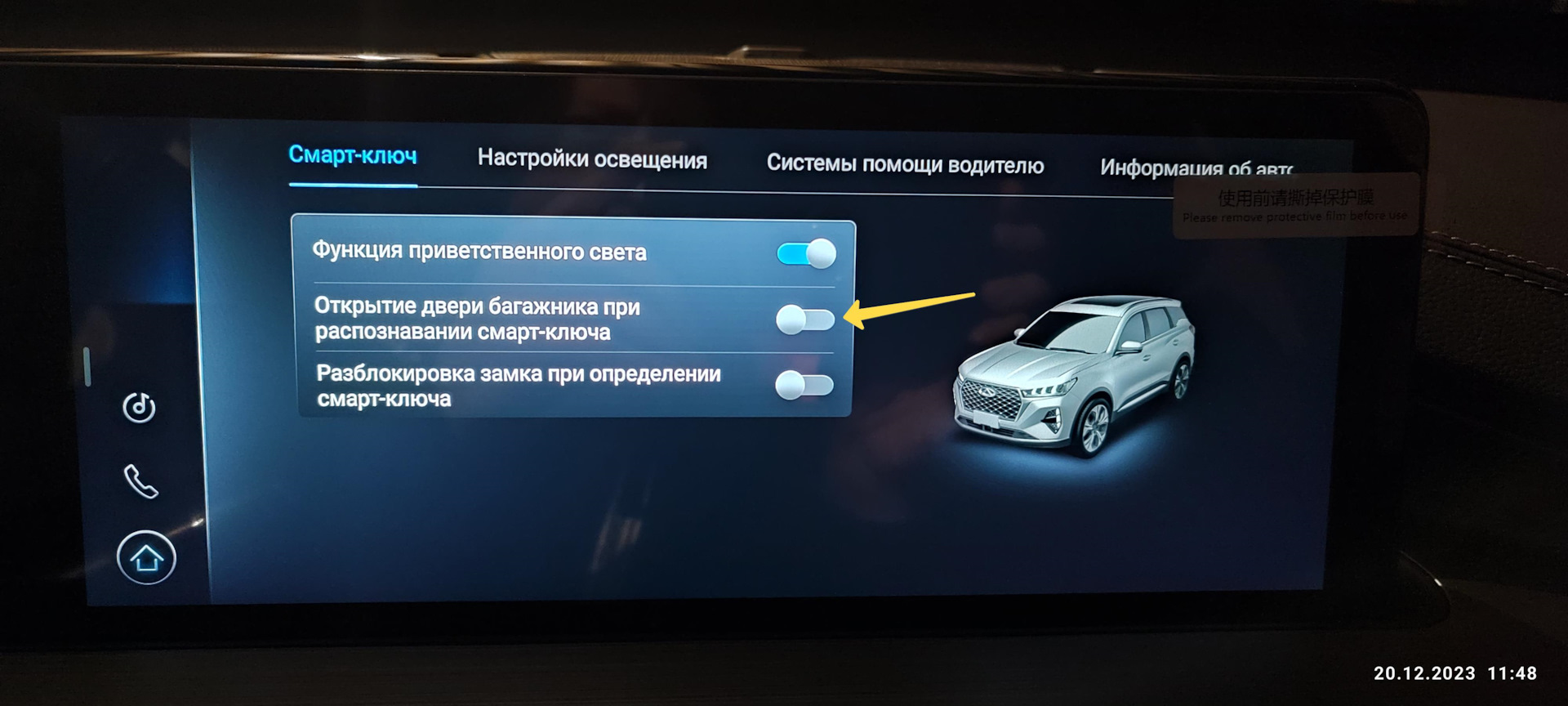 Если открылось окно с настройками, то во вкладке "Смарт-ключ" на пункте " Открытие двери багажника при распознавании смарт-ключа" надо переключить выключатель в положении ВЫКЛ (т.е серый цвет).