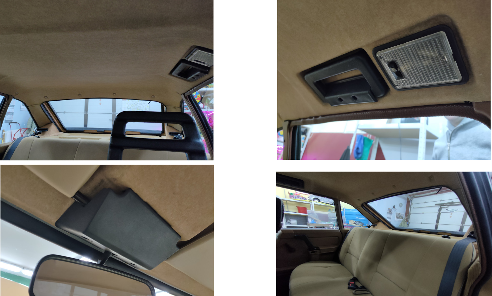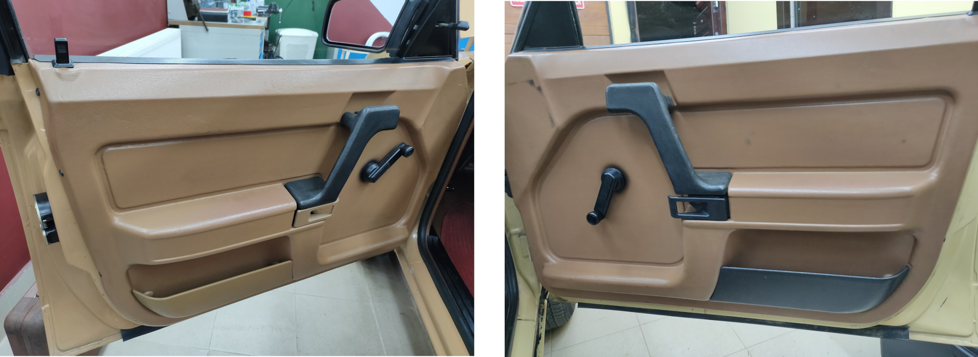 Цвет торпедо и дверных обивок очень похож. Сиденья другие — коричневые. За бежевые внутренние ручки не скажу — не помню за давностью лет.