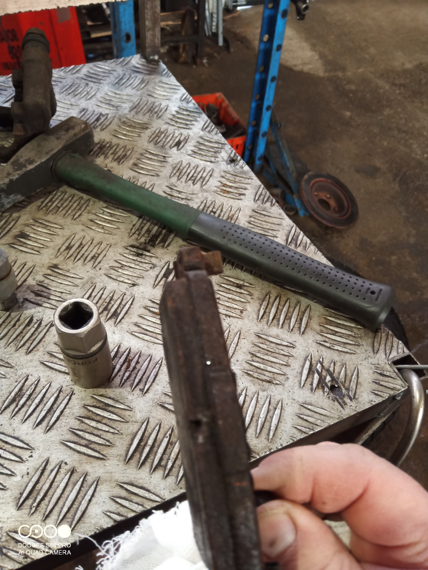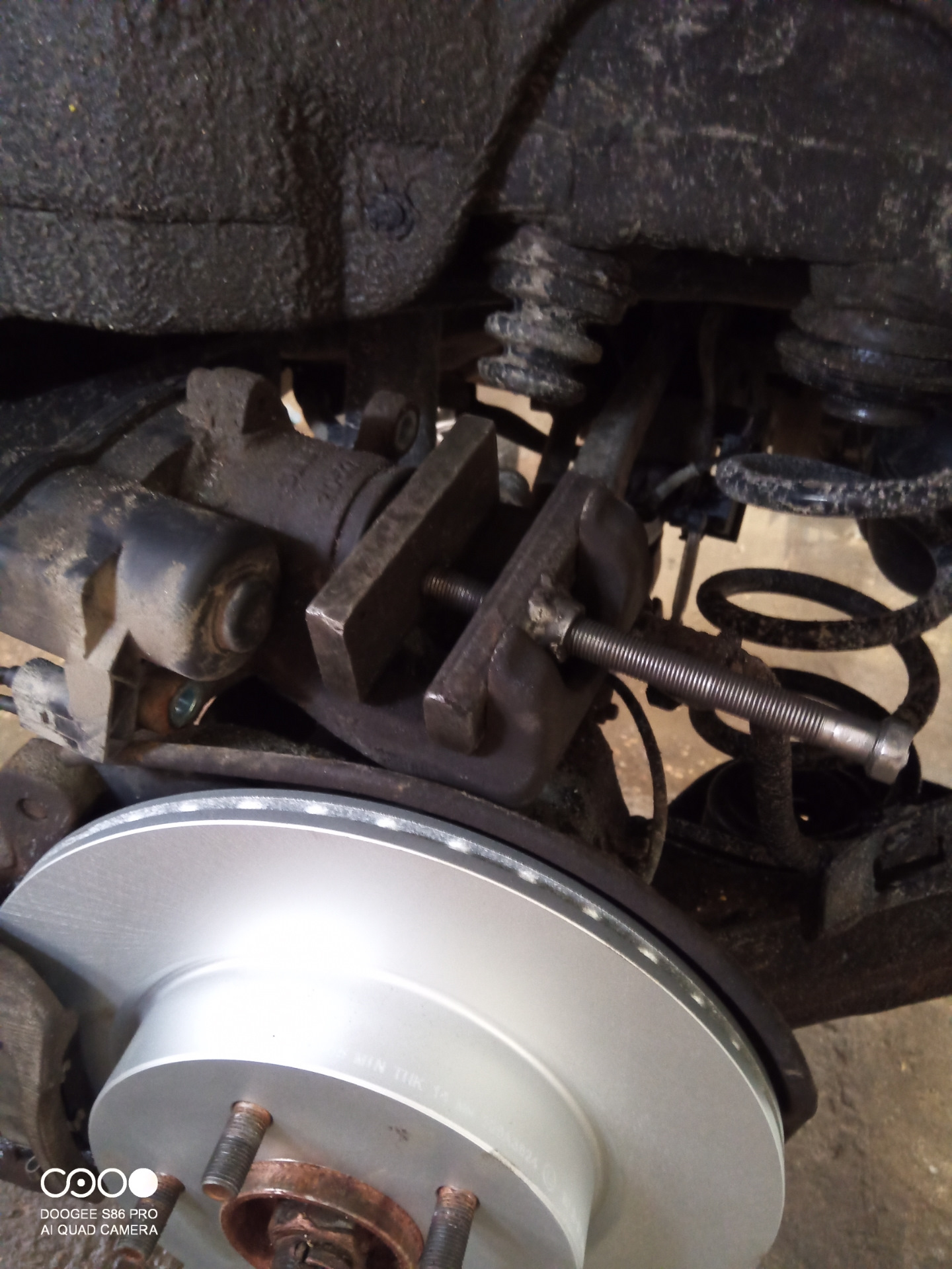 Причину Николай назвал, а затем и показал сразу, вся хрень в направляющих скобы, в которой заклинивают колодки. Из-за грязи, окиси от реагентов и пыли, их реально клинит, выбивали с молотком, без фанатизма, но всё же с усилием. Направляющие и поршень работали легко, проверили, понажимали, смазали, воздух выпустили…