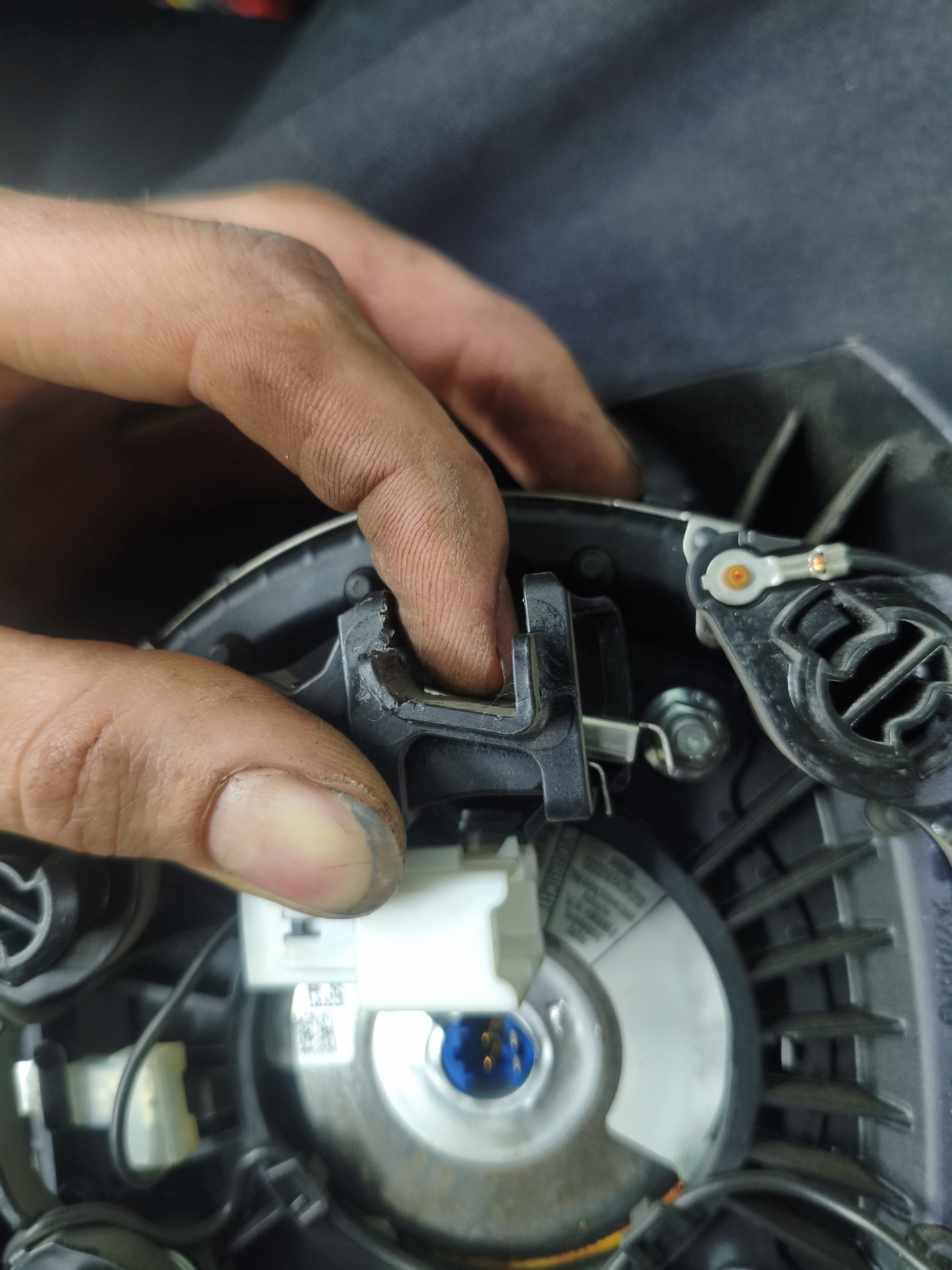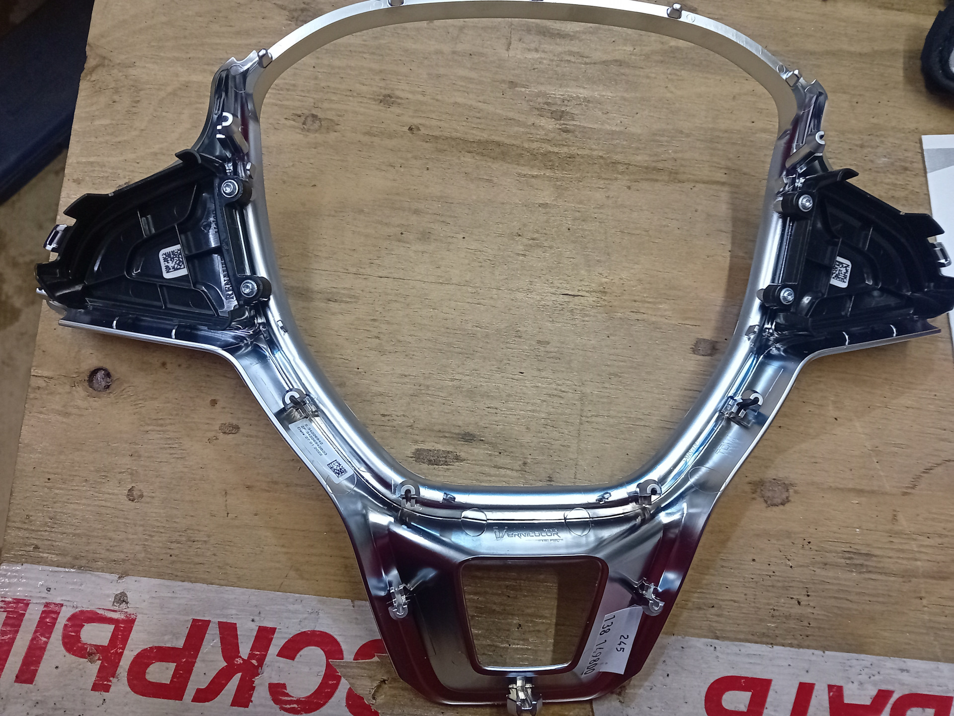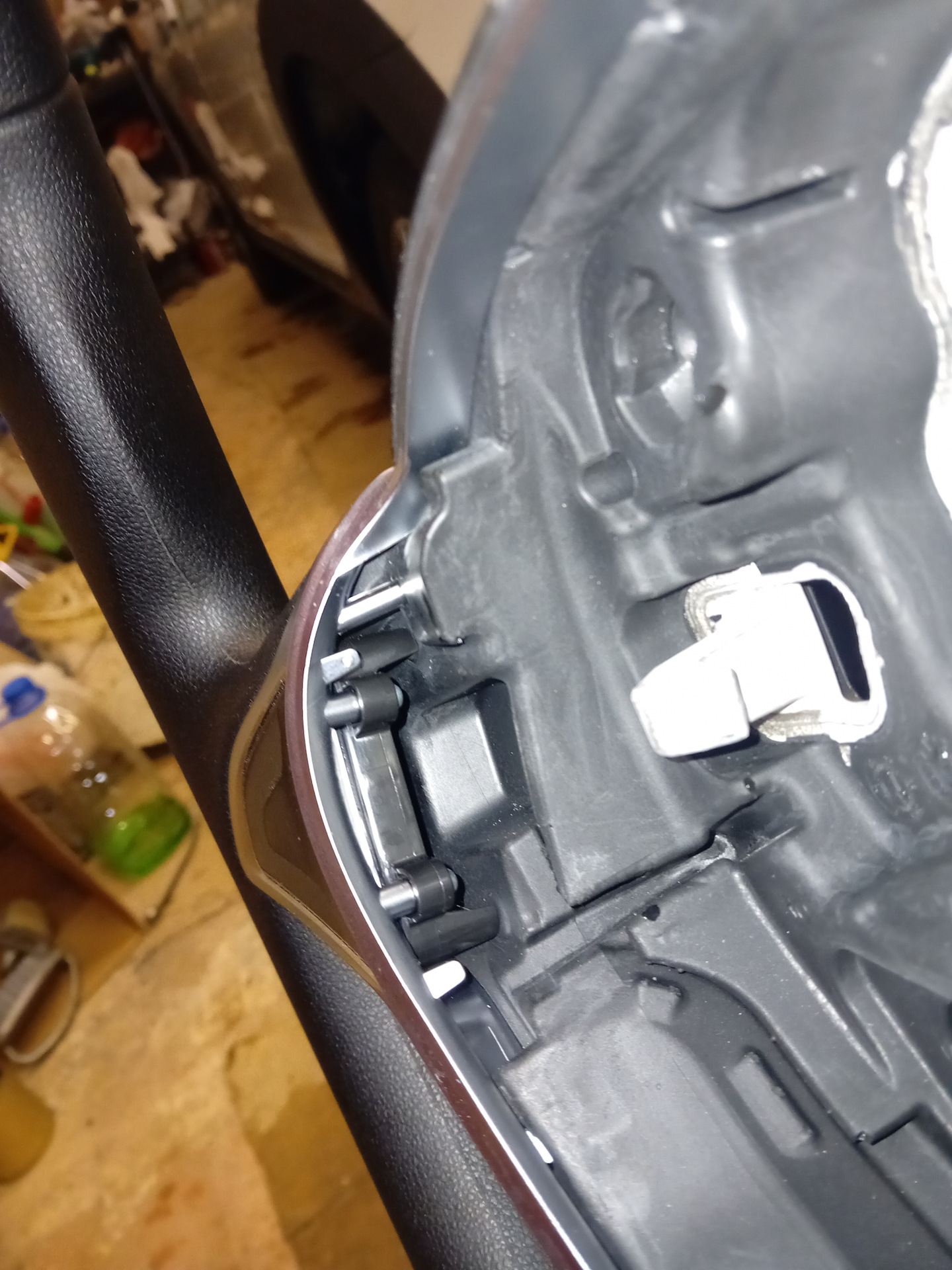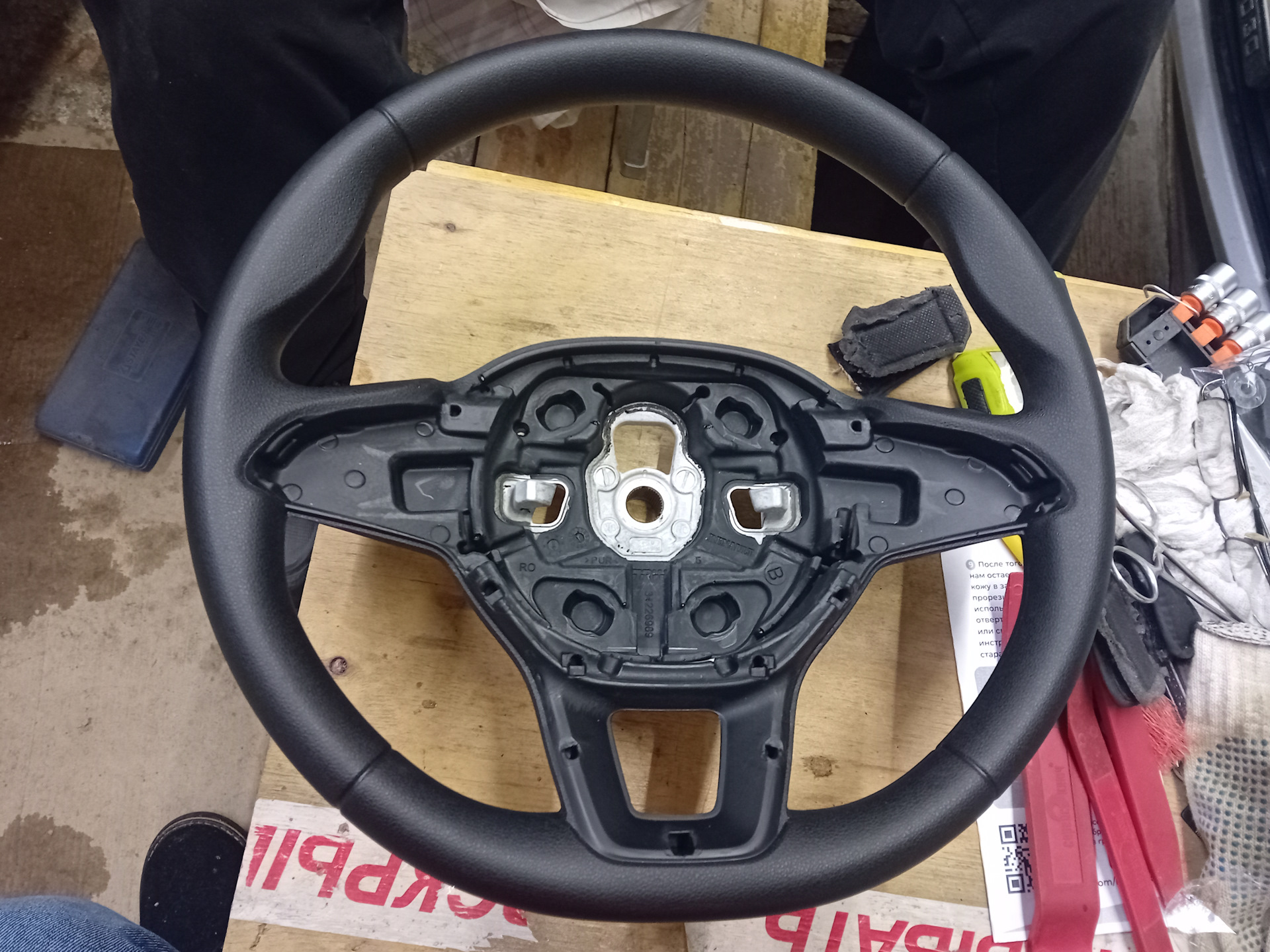 Смотрим снятый руль и видим — МАЛЕНЬКИЕ ШЕСТИГРАННИКИ! И не пролезть ключом никак! Так вот — эти шестигранники трогать не нужно! Они оказываются держат черную накладку под кнопки. Снятие. Аккуратно пластиковыми скрепками отдираем пластик от руля. Равномерно гнём скребком и всё будет гуд👍