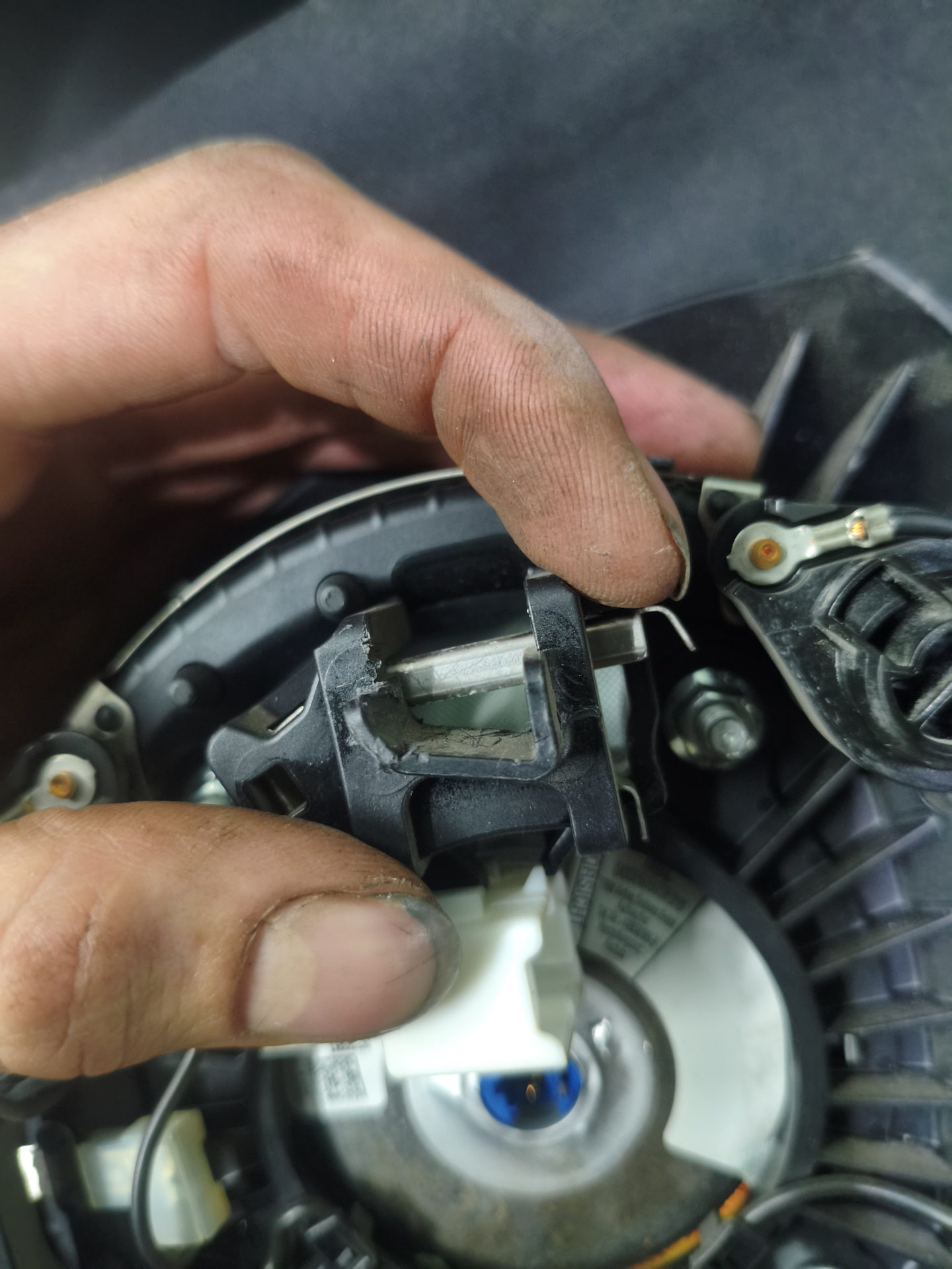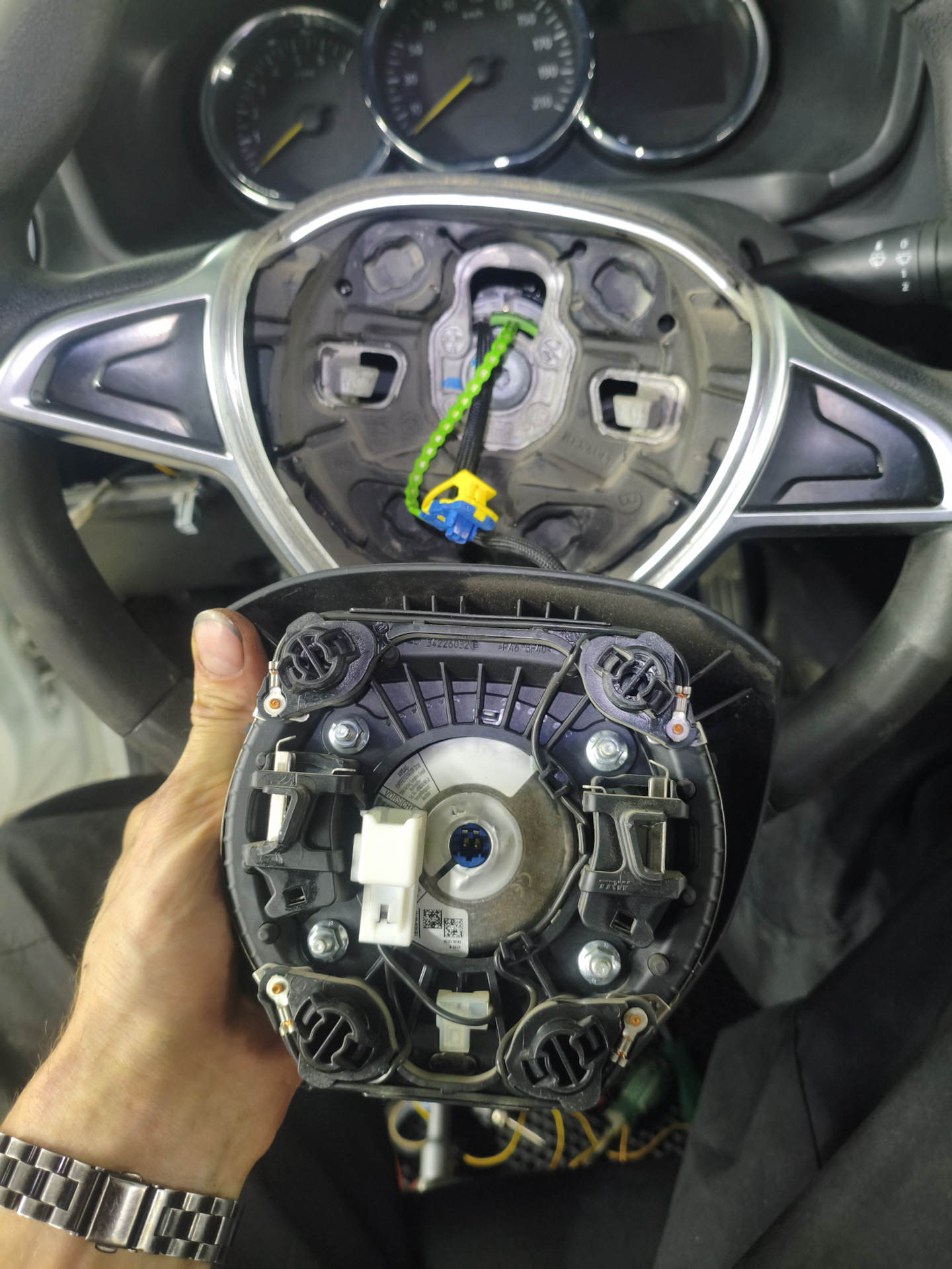 На боковинах руля есть маленькие выемки ( с обейх сторон) дырявим их маленькой плосеой отвёрткой (почти как шило) и давя на пазу защелки, подтягиваем подушку на себя. Как только появился небольшой зазор, приступаем к другой стороне. Отщелкнув пазы, аккуратно пластиковыми скребками подтягиваем на себя, и подушка выходит. Подушку сняли.