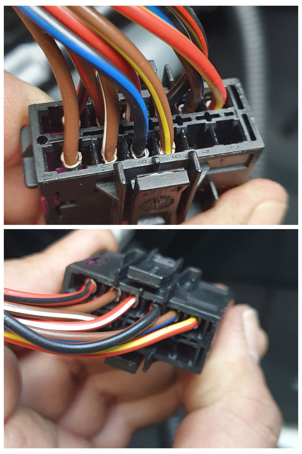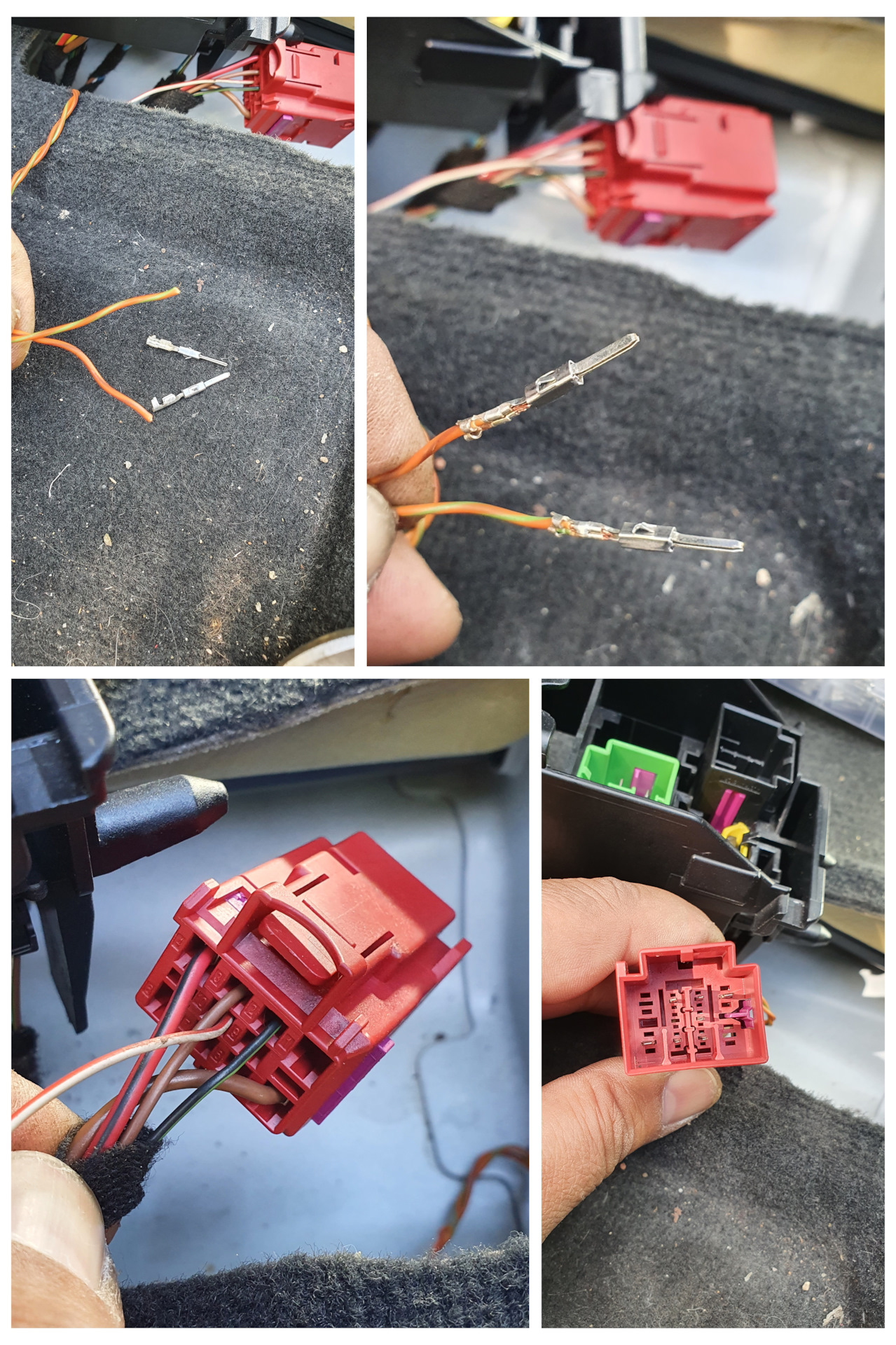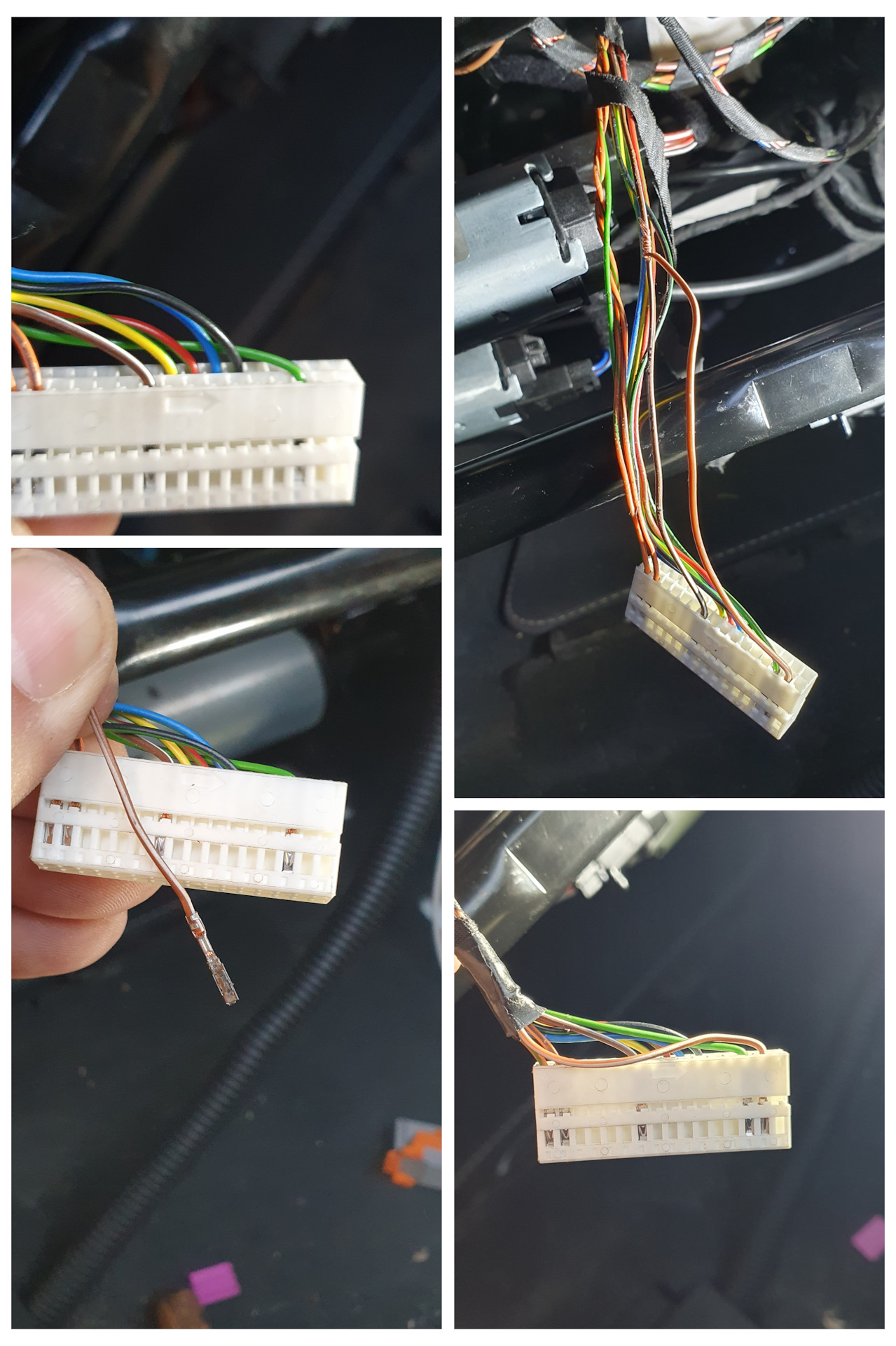 Берем и разматываем изоленту от двух разъемов старого блока управления кнопками до момента точек соединения питания и массы, можно чуть больше, так будет удобнее работать. Распиновываем старый 10-контактный разъем силовых проводов и перепиновываем их в новый 12-контактный разъем 4B0973721, теперь питание будет подавать сам блок.