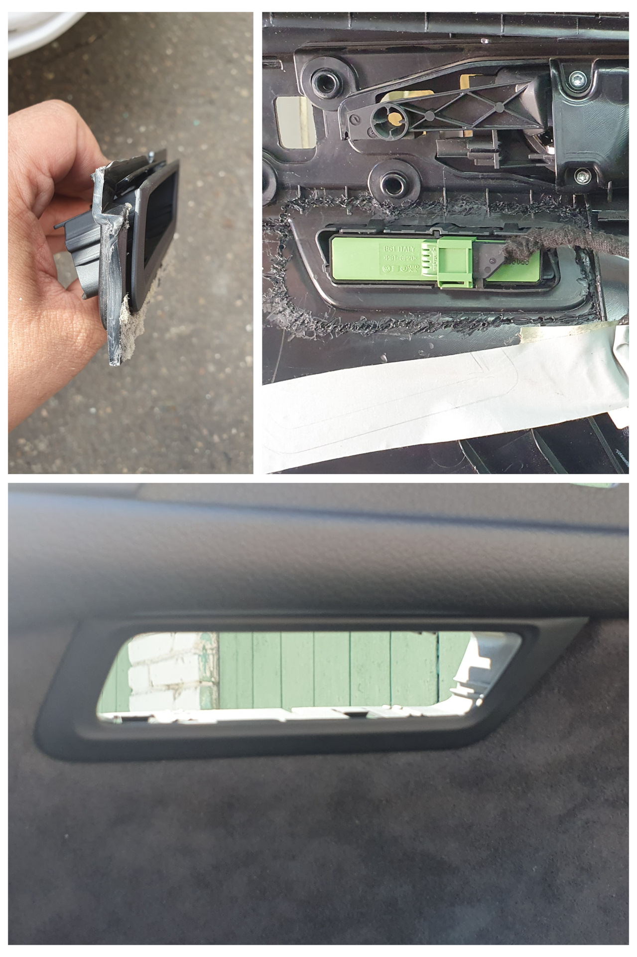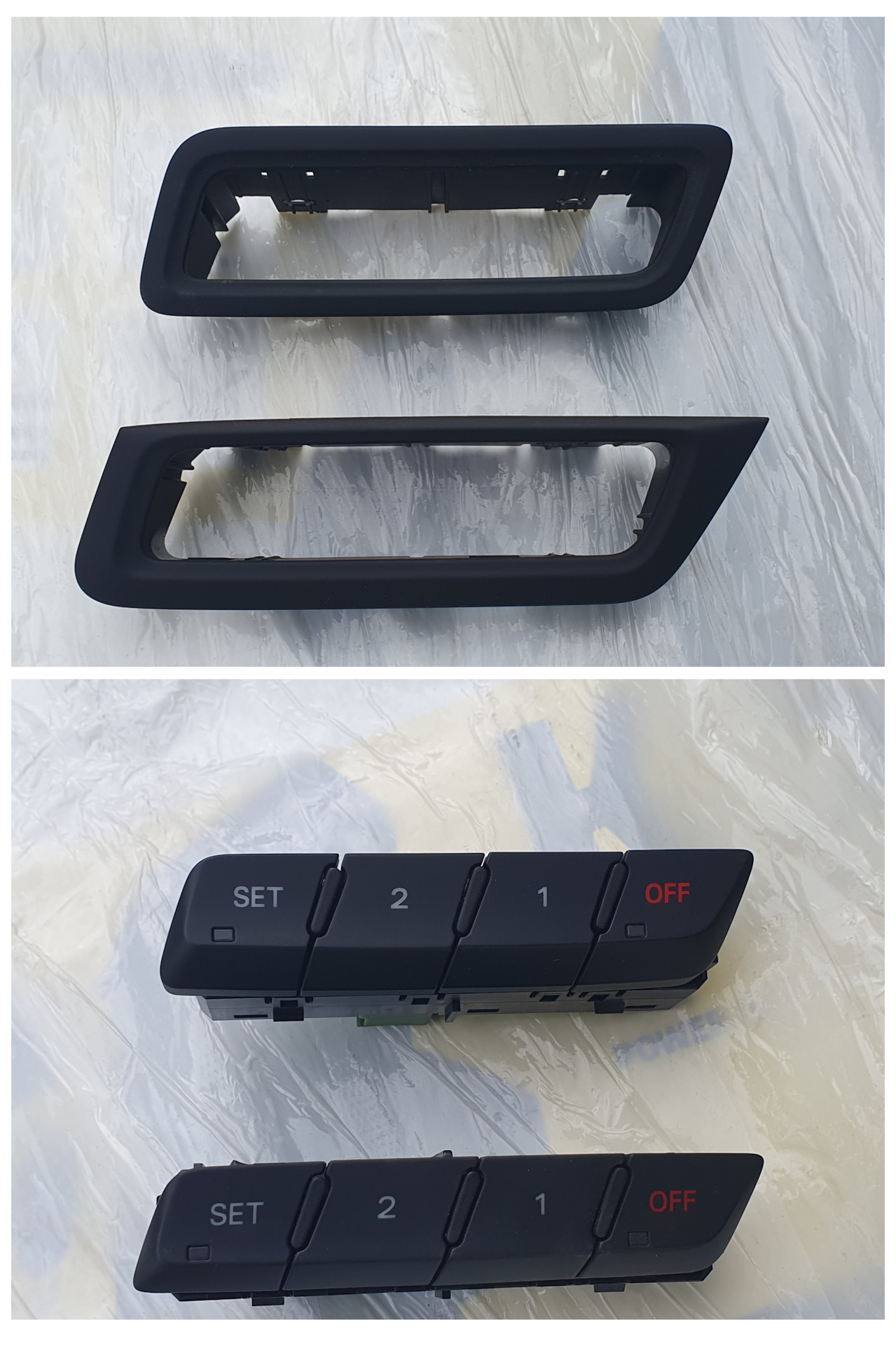 И в заключение мы переходим к карте дверей. Нам необходимо в ней установить блок кнопок памяти положения и соответственно их подключить к блоку управления двери пассажира. Кнопки есть для дорестайловых карт, так и рестайлинг. Их отличие основное в форме рамки-кронштейна, куда встают кнопки и само место расположения установки. Рестайлинг устанавливается вплотную под окончание вставки карты, дорест немного ниже с отступом. Вот небольшое внешнее сравнение кнопок. Сами кнопки тоже немного отличаются. Кнопки и кронштейны взаимозаменяемые.