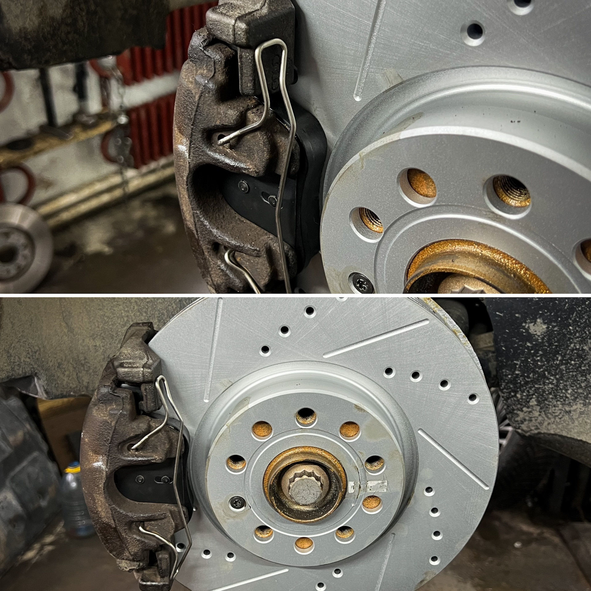 Перейдем к установке. Делал все традиционно в DME, установка проходит болт он, снимаем старые, ставим новые. Конкретно в моем случае есть один недостаток и внешний вид суппортов. Он реально портит картину, ближе к лету ими нужно обязательно заняться и покрасить.