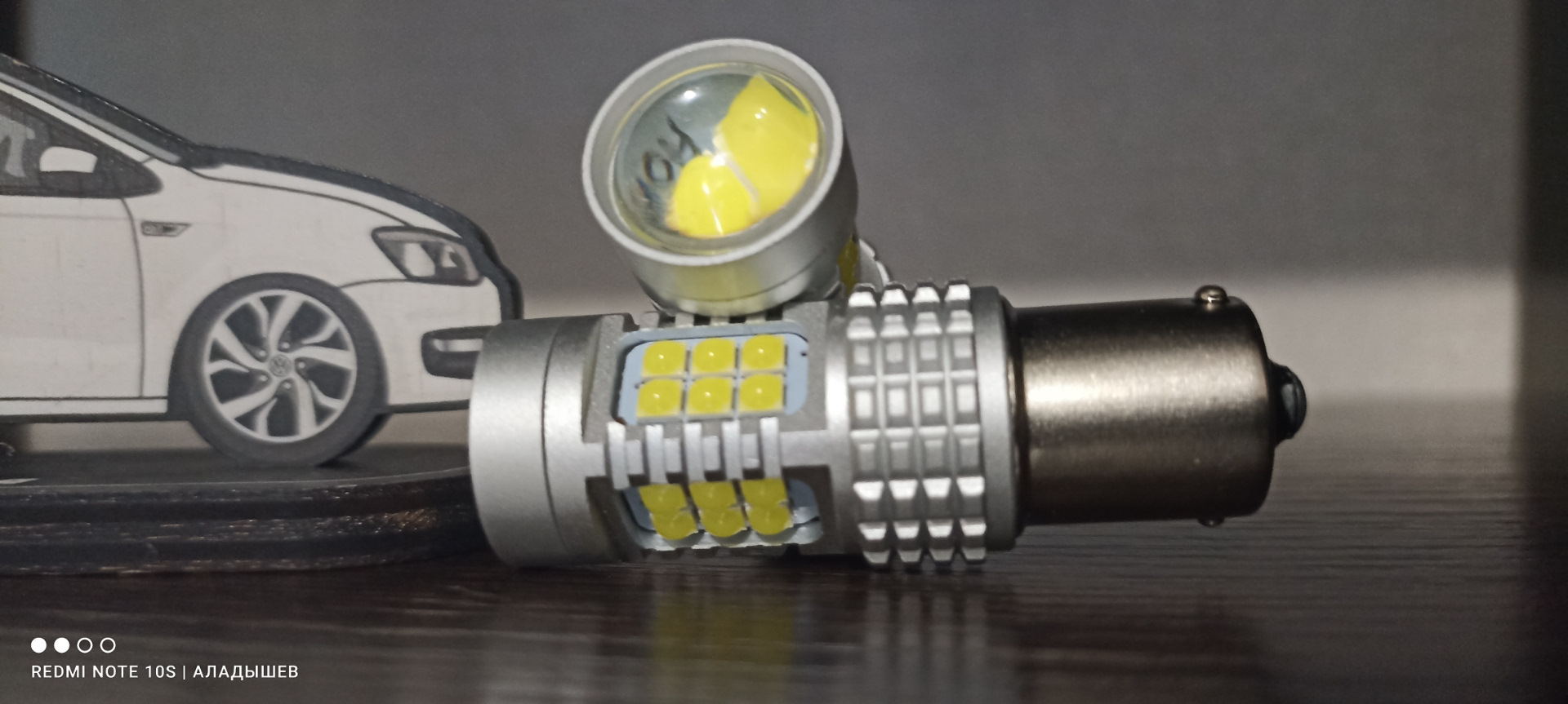 Лампы LED TIV с цоколем P21W. Лампы сделаны качественно. Очень понравилась обработка. Никаких заусенцев. Завод. Выглядит достойно. Светит тоже очень достойно. Светодиоды светят в 5 направлений. Линза собирает в пучок свет который направлен вперёд. Производитель заявляет температуру свечения 5000к.