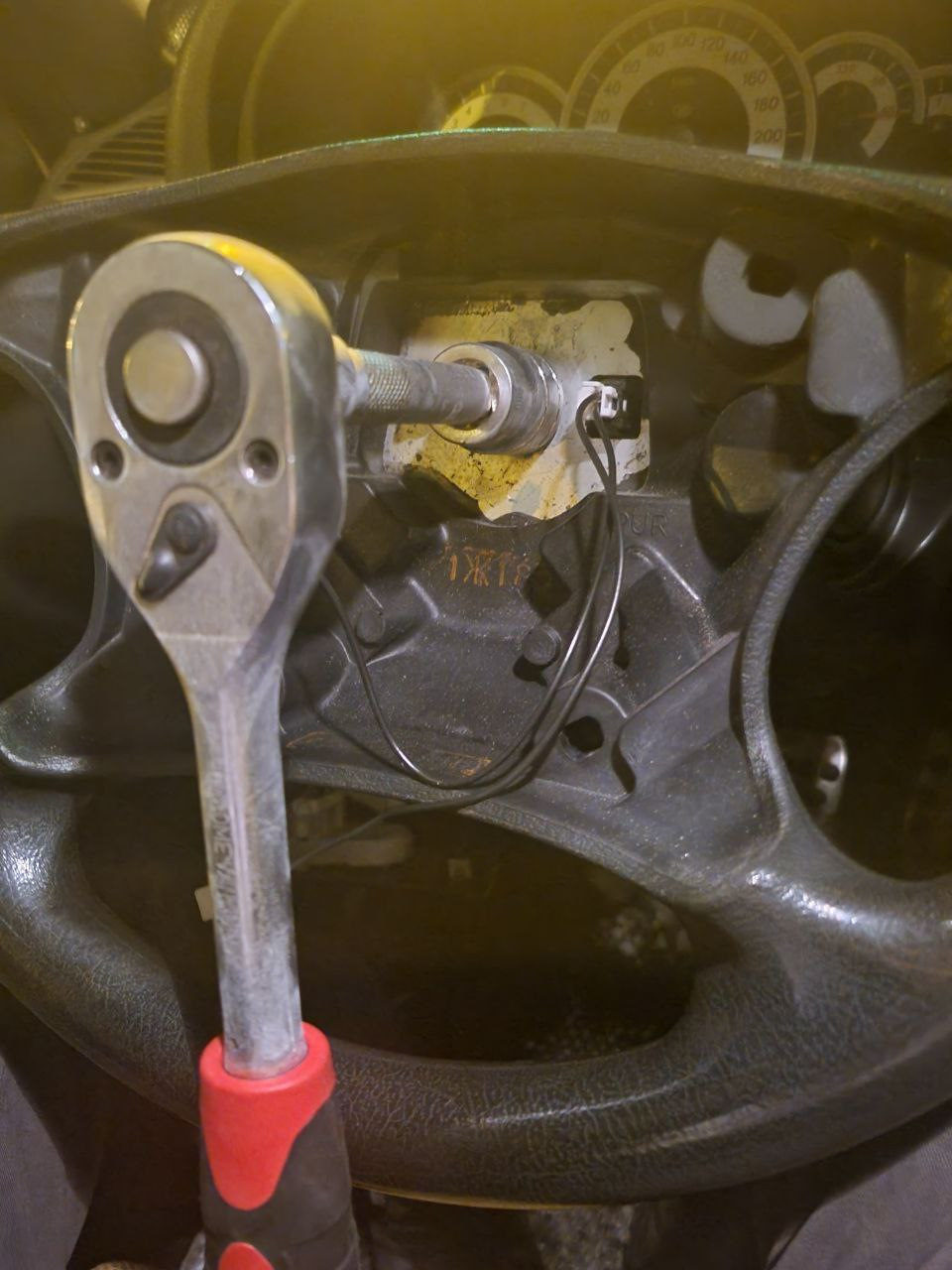 Далее нам понадобиться головка на 24 и трещотка соответственно, если руль не заблокирован, то удерживаем ногами его, чтобы сорвать гайку.