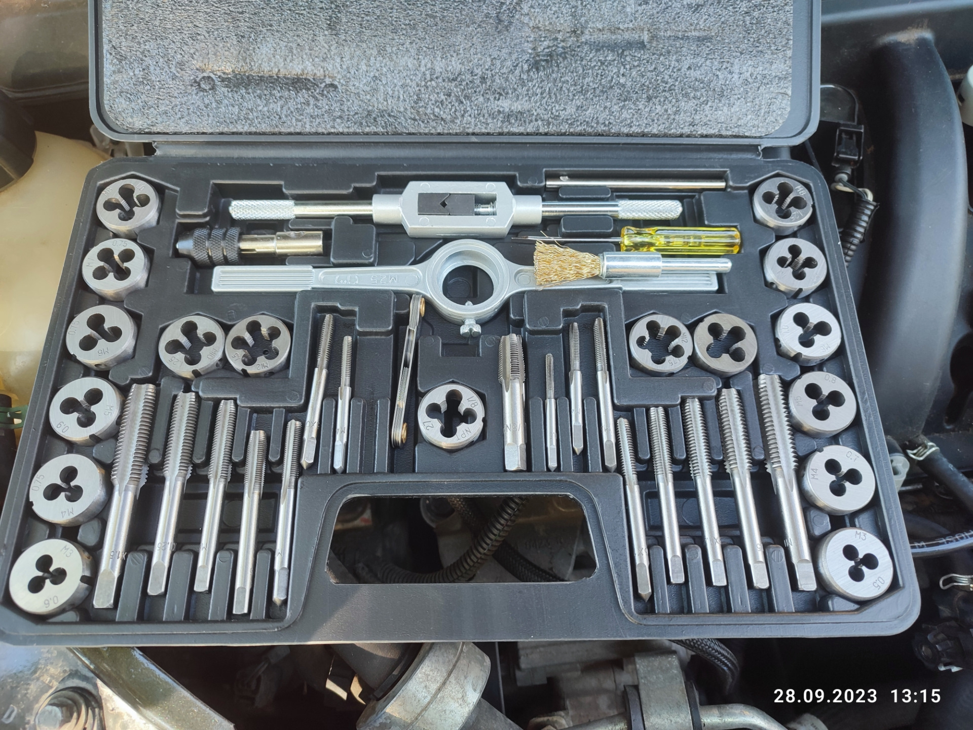 Набор состоит из 40 предметов выполненных из прочной инструментальной стали. Каждый предмет в наборе находится на своем месте, в индивидуальном посадочном месте. Кейс с резьбонарезным набором удобно хранить, пользоваться и транспортировать.