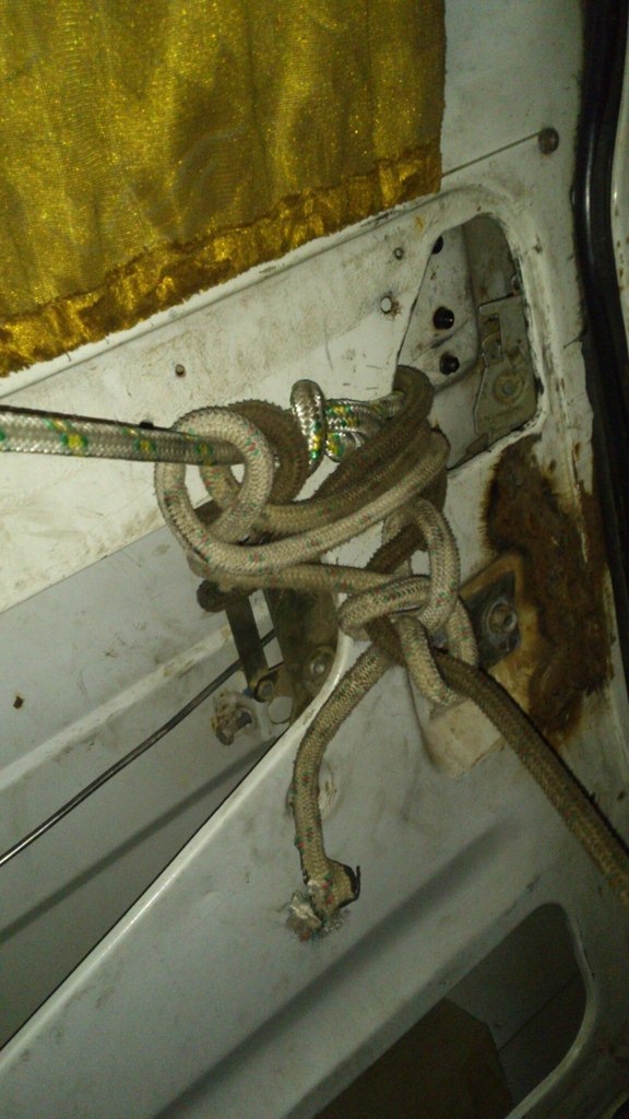 Уже темнело, а без двери машину не оставишь, прикрепил всё назад, закрыл как-то с ноги и приявязал внутри верёвками: