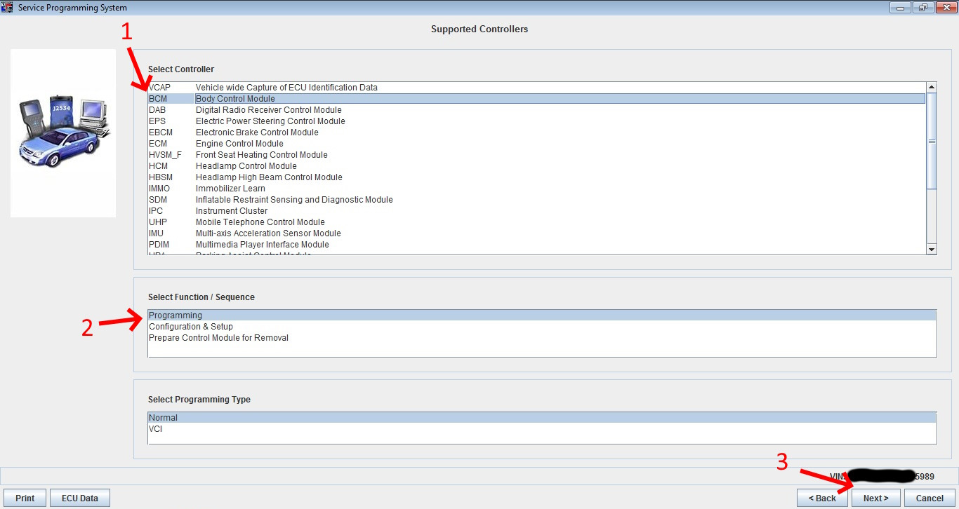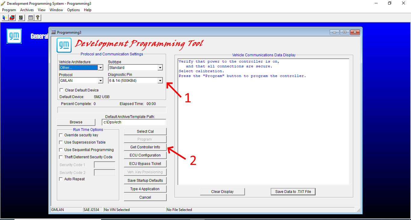 Подключаем по схеме, запускаем GM DPS. Для соединения с BCM в Diagmostic pin выбираем 6&14 (500KBd). Лезем в Get controller info.
