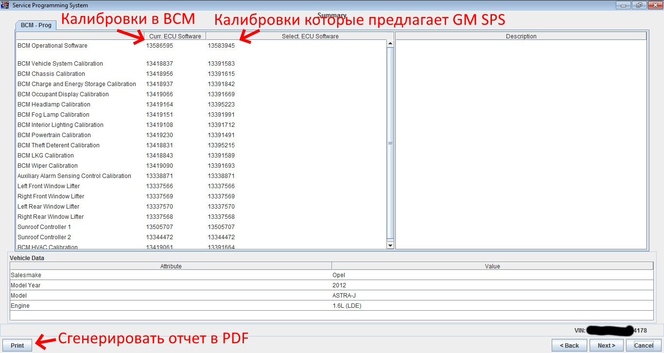 Тут же по кнопке print, можно сгенерировать отчет в pdf формате о калибровках записанных в блоке и то что предлагает установить GM SPS. И тут у нас вырисовывается проблемка tis2web.service.opel.com/tis2web/ и GlobalTISv32 SPS показывает разные калибровки для одинаковых BCM/VIN. Это вариант нормы, все течет и все меняется, tis2web.service.opel.com/tis2web/ показывает самые актуальные калибровки, GlobalTISv32 GM SPS показывает «актуальные» калибровки на конец 2011 года. Придется переписывать нашу таблицу калибровок с учетом реалий GlobalTISv32.