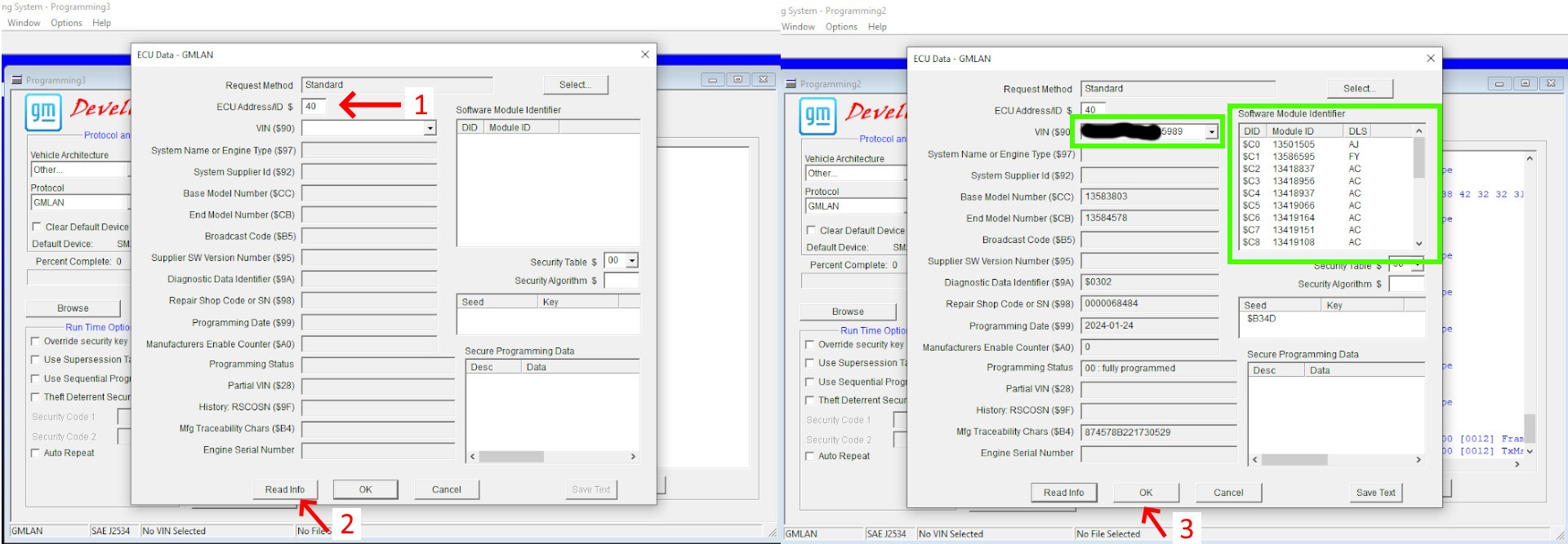 В ECU Address/ID пишем 40 (Адрес BCM). Жмем Read info. Если все подключено верно то увидите VIN и калибровки блока.