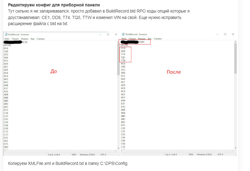 Тут я сильно не запаривался, просто добавил в BuildRecord.bld RPO коды опций которые я доустанавливал: CE1, DD8, T74, TQ5, TTW и изменил VIN на свой. Еще нужно исправить расширение файла с bld на txt.