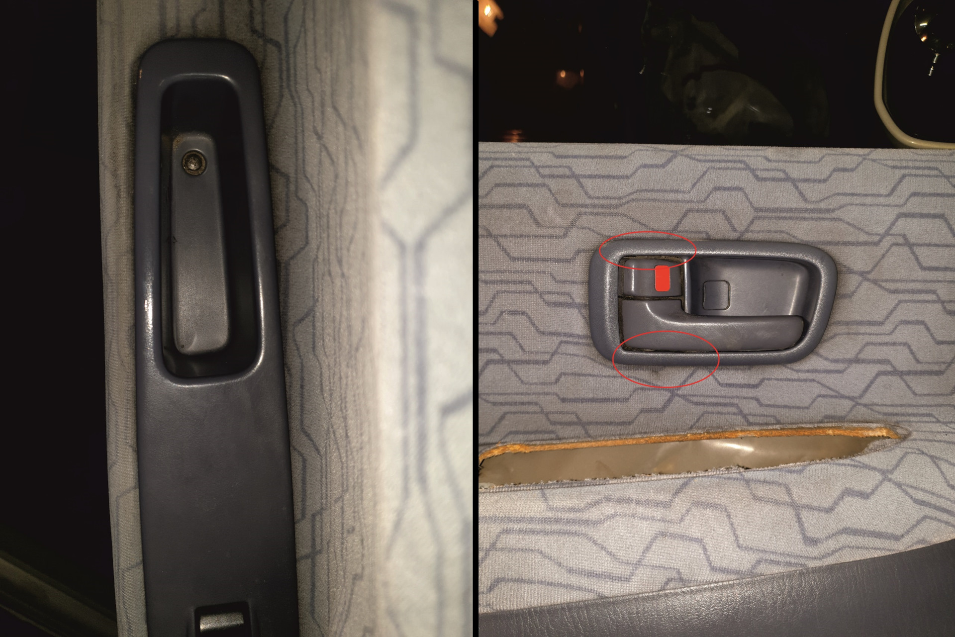 Следующим действием выкручиваем саморез из блока управления стеклоподъемником, отсоединяем фишку с блока и убираем его, после откручиваем шуруп с дверной ручки который находится под заглушкой. Что бы снять саму ручку, нужно пластиковой лопаткой отогнуть места которые указаны на фото и тогда ручка соскочит с мест посадки и легко снимется. После всех этих действий срываем дверную карту с клипс сидит она там очень плотно и тяжело снимается.