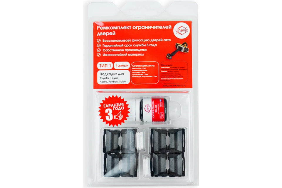В данной статье хочу рассказать вам об Ремкомплекте ограничителей дверей Unevix.За долгое время пользования своим автомобилем уже давно заметил такую проблему, что родные ограничители дверей престали выполнять свою функцию и двери даже почти на ровной поверхности стали сами закрываться. После чего и было принято решение заменить их. Воспользовавшись интернетом и драйвом, просмотрев множество вариантов более дешевых, а так же китайские аналоги, пришел к мнению, что ограничители лучше взять от фирмы Unevix. У данных ограничителей идет более качественный состав по сравнению с более дешевыми аналогами, сам производитель дает гарантию 3 года, а так же о них большое количество положительных отзывов. Сами ограничители я брал через озон за 1699, доставка заняла около 2 х недель Ссылка на магазин