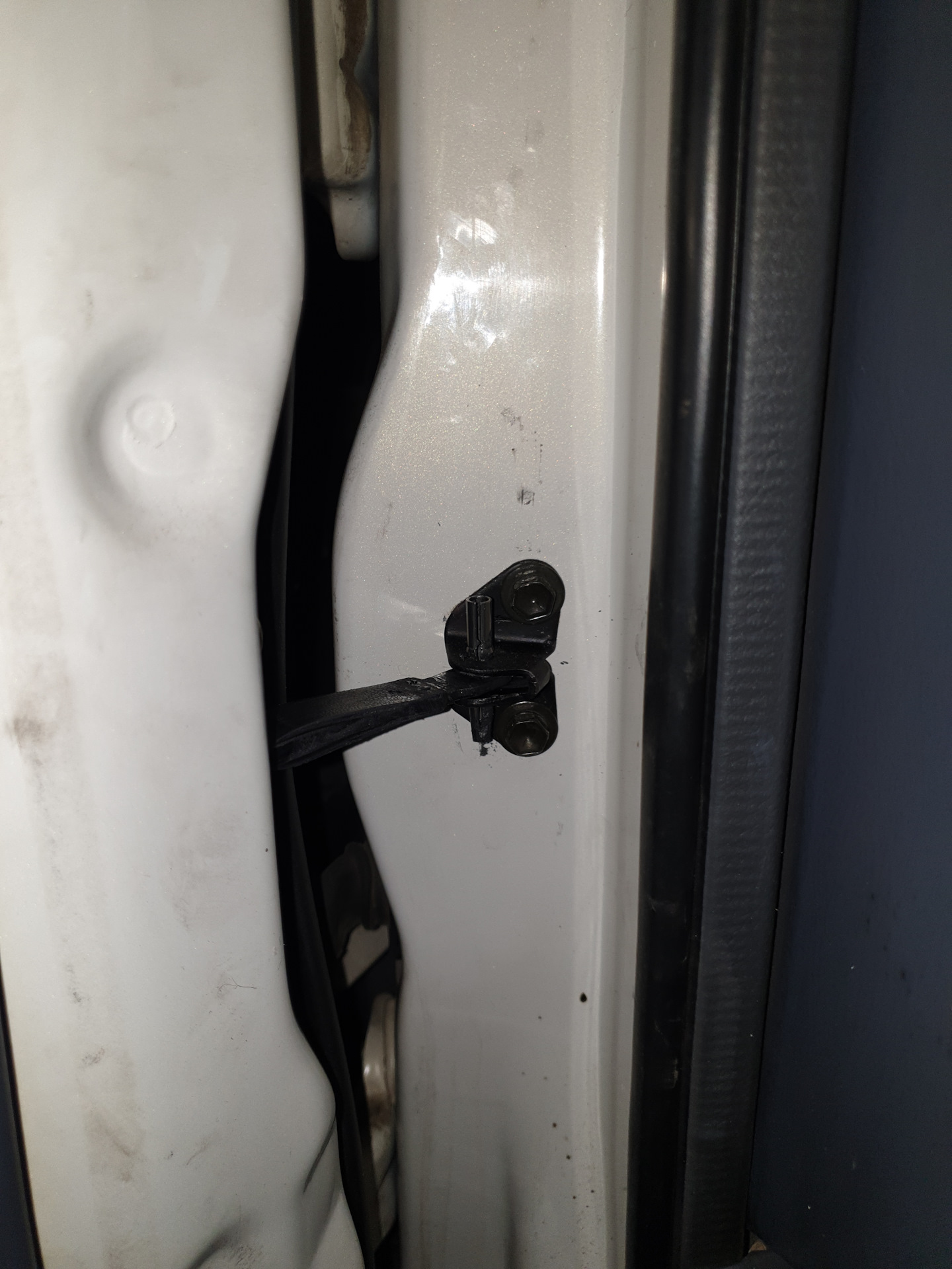 Теперь вынимаем этот штырь, откручиваем ограничитель со стороны двери и достаем его. На 3 дверях данный штырь у меня вынимался легко почти без усилий, просто пальцами, а вот на передней пассажирской двери пришлось выбивать его аккуратно маленьким молотком.