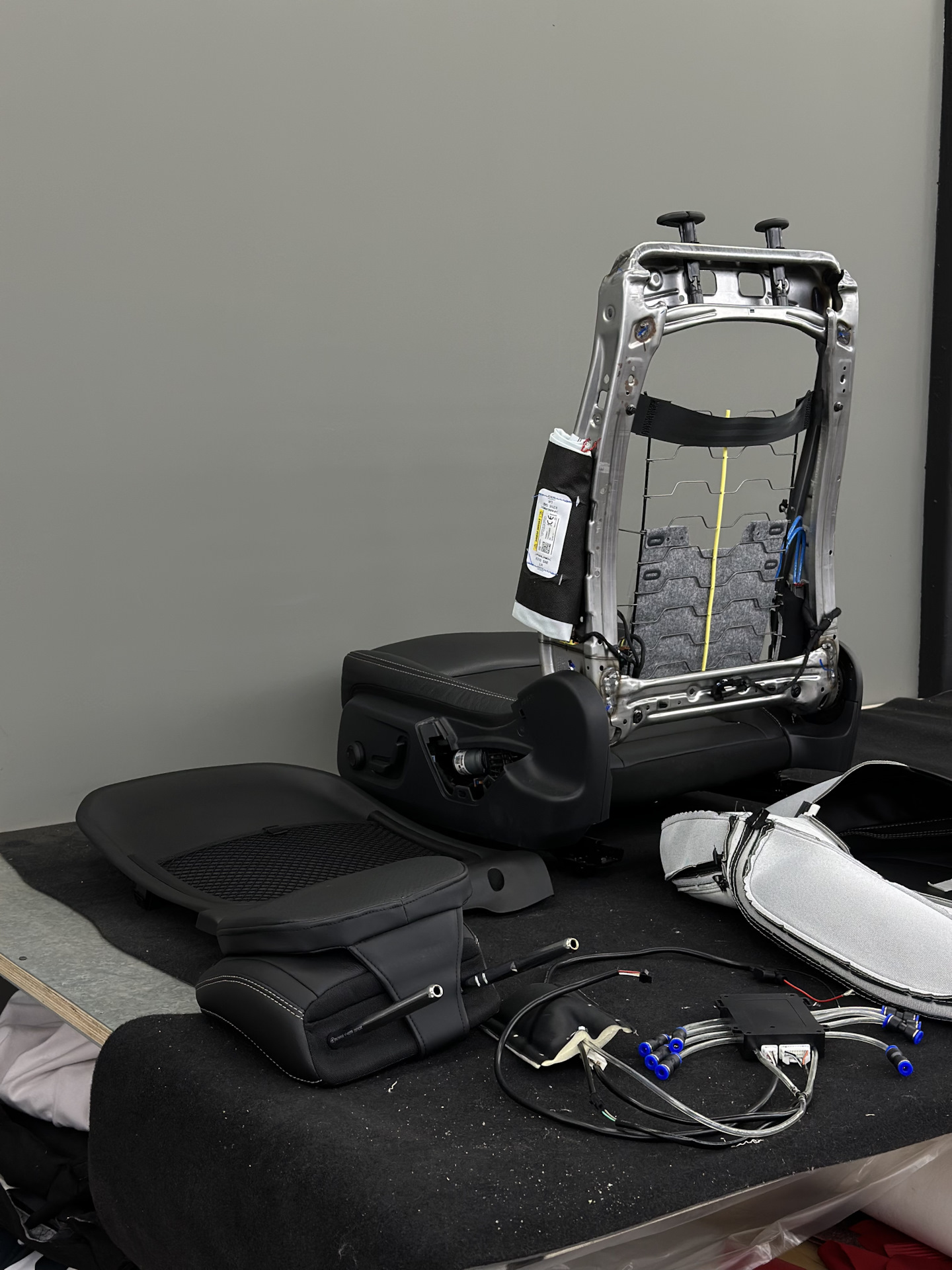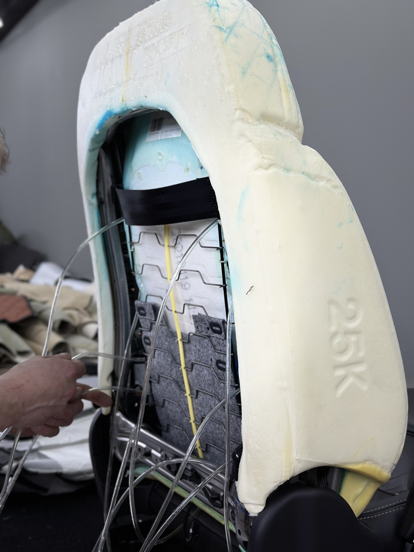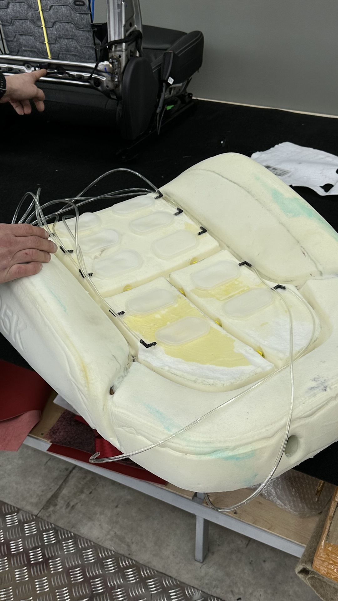 Параллельно другой мастер занимался сиденьем, снял кожаную обивку и отстегнул поролон.